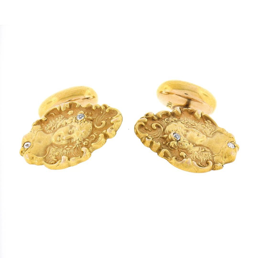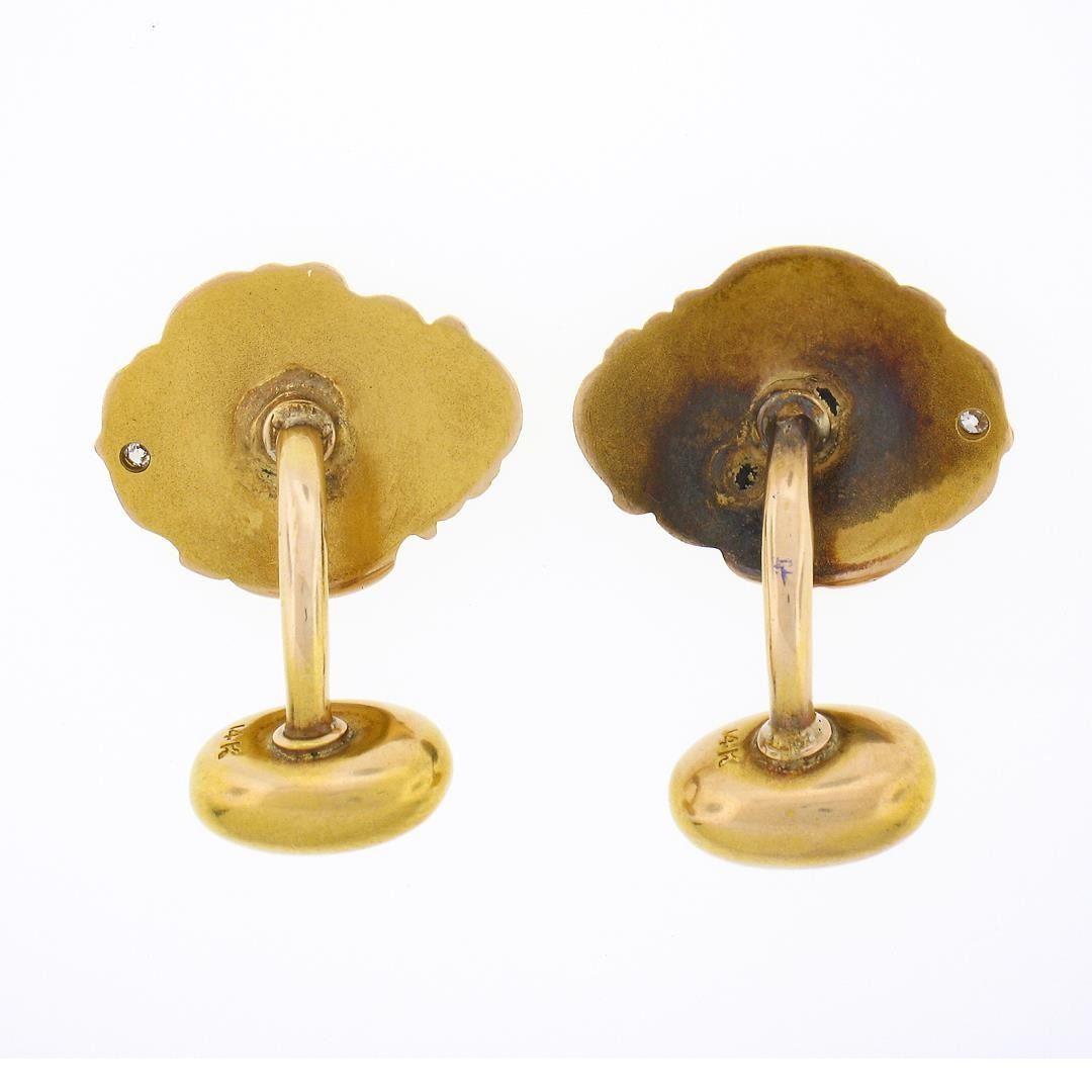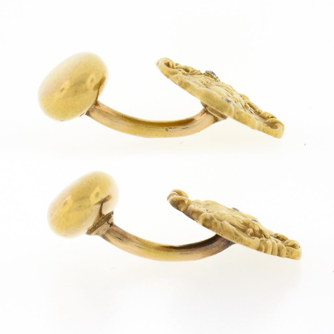 An antique solid 14k yellow gold men's cufflinks, featuring 4 old single cut natural diamonds (G/H - VS2/SI1 ; 0.04ctw). These cuff links have a fixed back design with a clearance of 7mm, weigh a total of 5.18 grams, and the front panels measure 18.70x14.9mm.