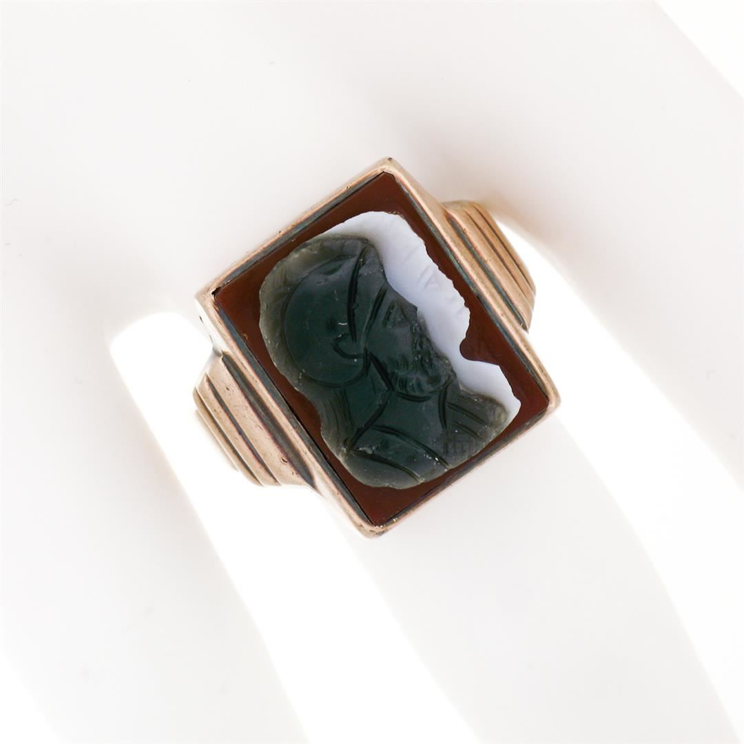 An antique solid 10k rosy yellow gold ring, with 1 rectangular shape natural carnelian (15.80x11.90mm), toped with natural agate (black and white colors). The ring is size 9.0, weighs a total of 6.63 grams, and measures 17.25mm wide.