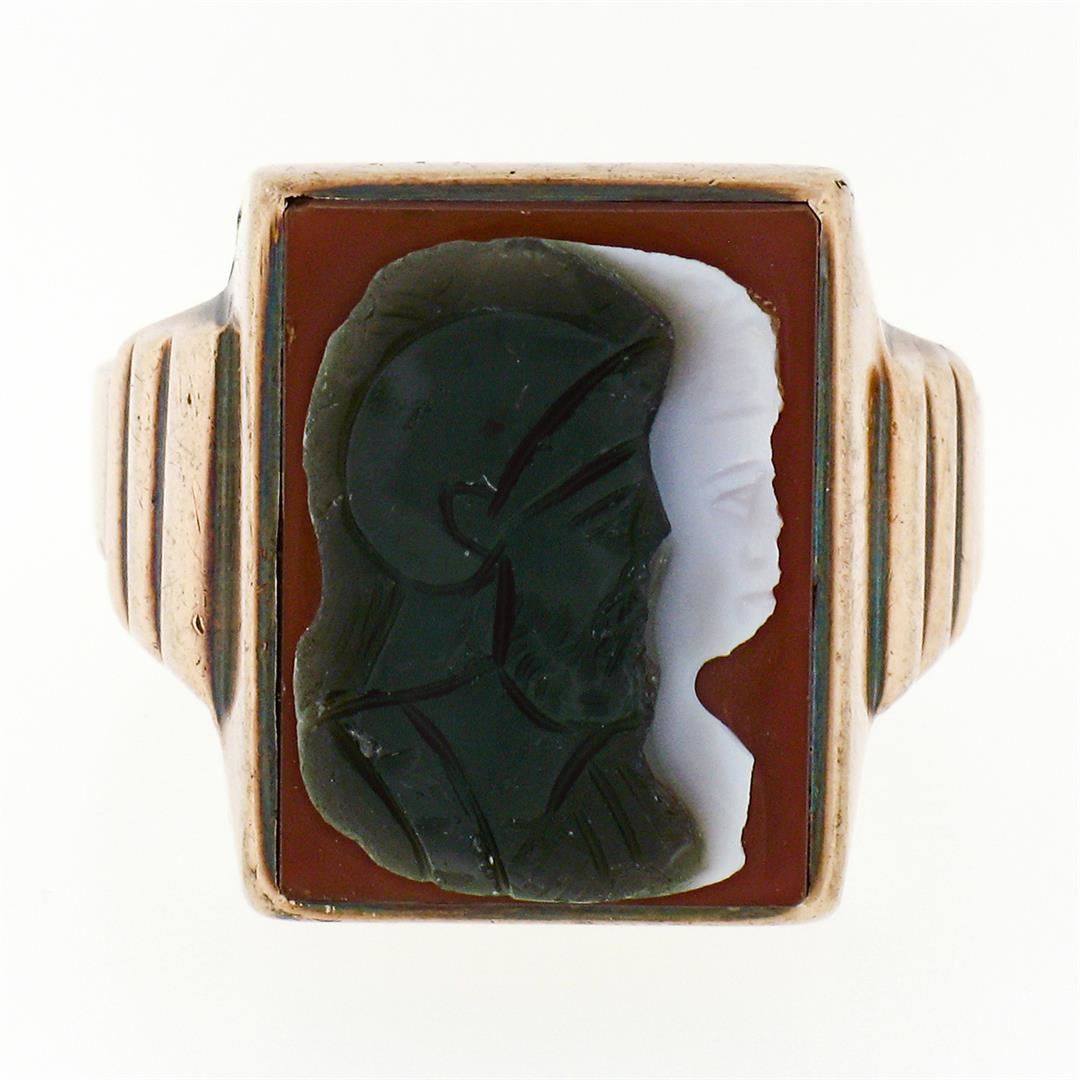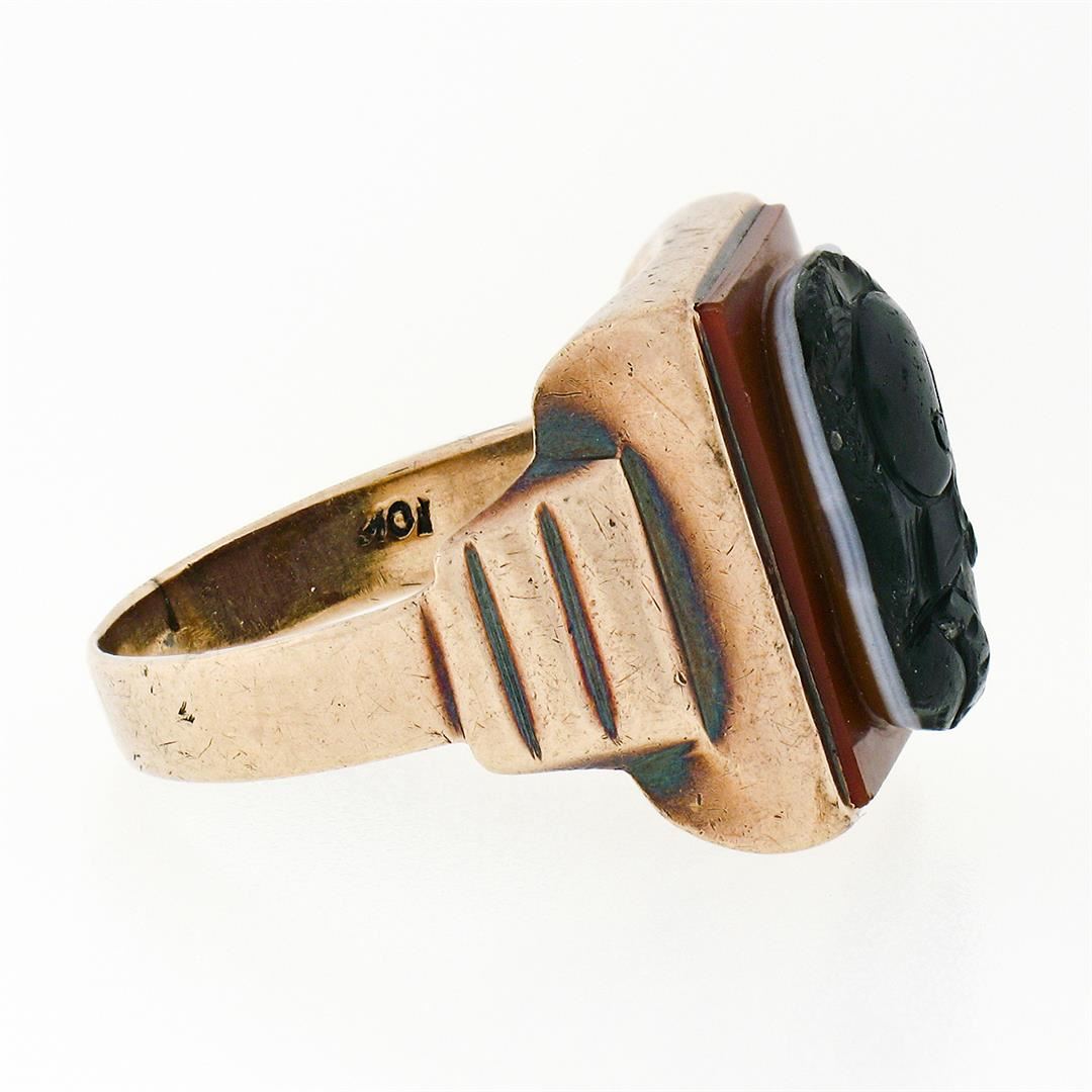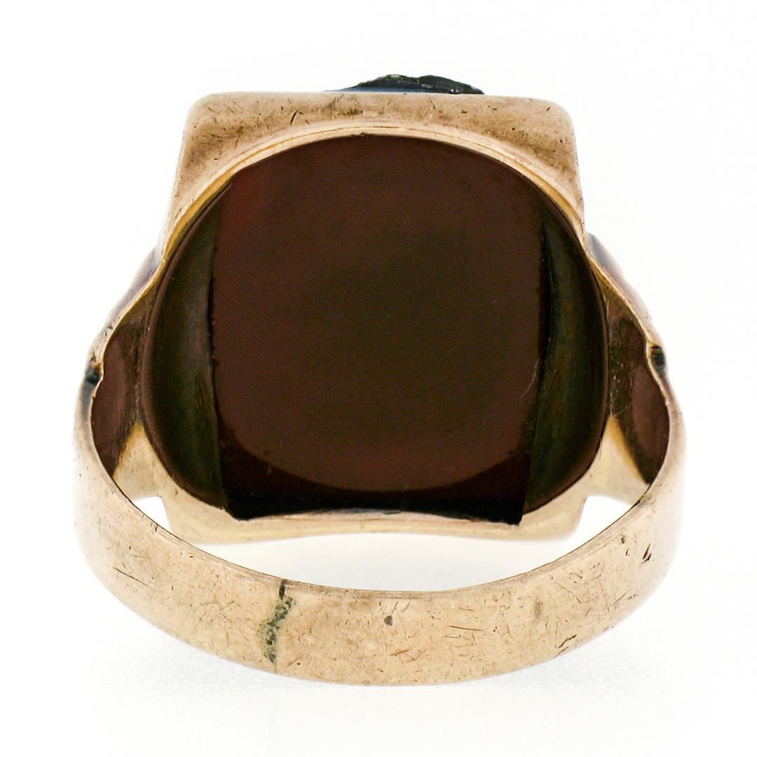 An antique solid 10k rosy yellow gold ring, with 1 rectangular shape natural carnelian (15.80x11.90mm), toped with natural agate (black and white colors). The ring is size 9.0, weighs a total of 6.63 grams, and measures 17.25mm wide.