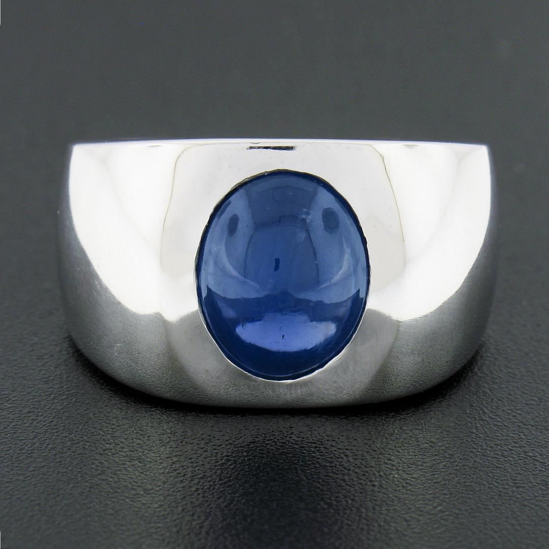 A solid platinum solitaire men's band ring, with 1 Gubelin graded oval cabochon cut natural sapphire (9.01ct). The ring is size 8.5, weighs a total of 24.78 grams, and measures 14.6mm wide. Comes with all original relevant certifications.