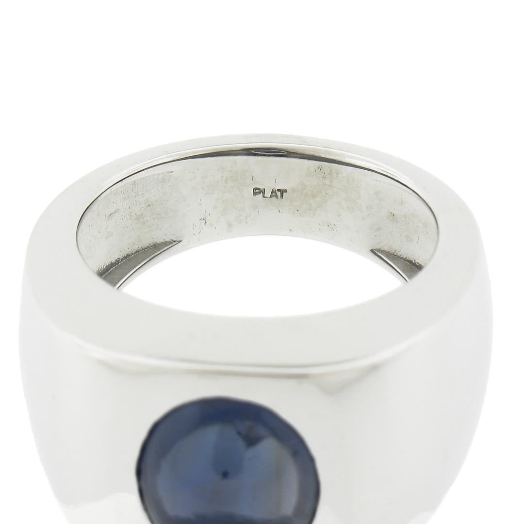 A solid platinum solitaire men's band ring, with 1 Gubelin graded oval cabochon cut natural sapphire (9.01ct). The ring is size 8.5, weighs a total of 24.78 grams, and measures 14.6mm wide. Comes with all original relevant certifications.