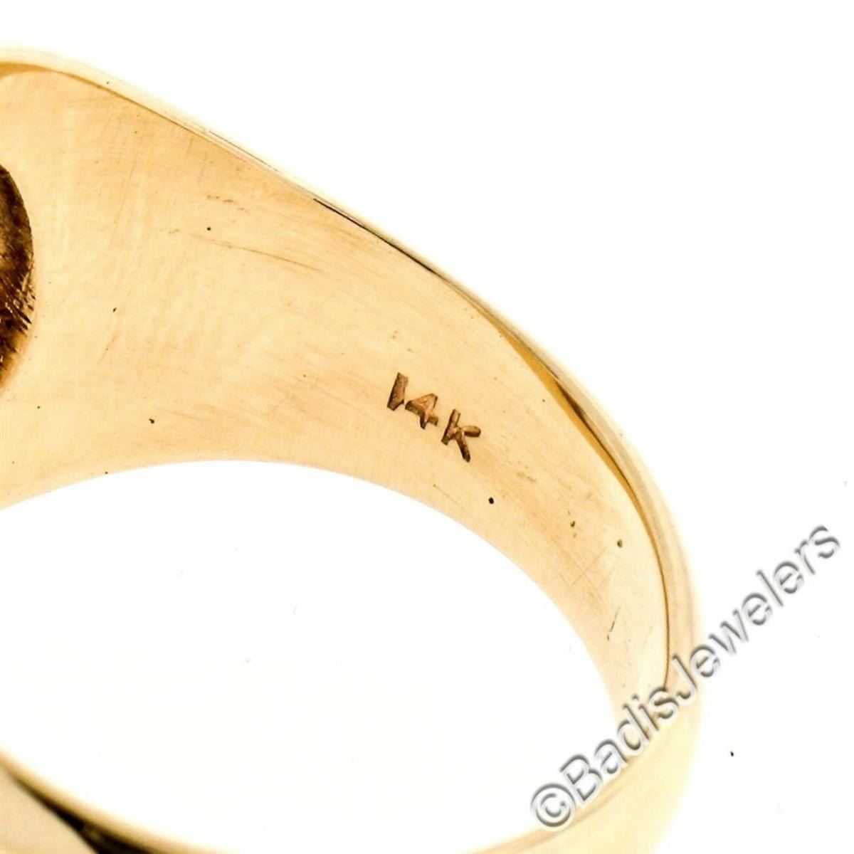 A men's 14kt yellow gold 14.5x10.0mm oval blue moonstone solitaire ring. The ring is size 8.0, weighs a total of 10.27 grams, and measures 17.2mm wide.