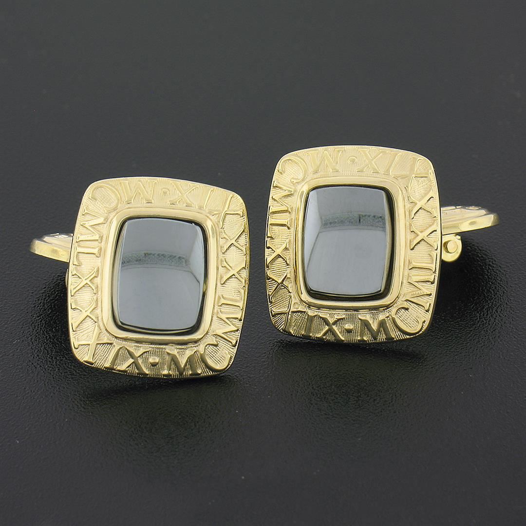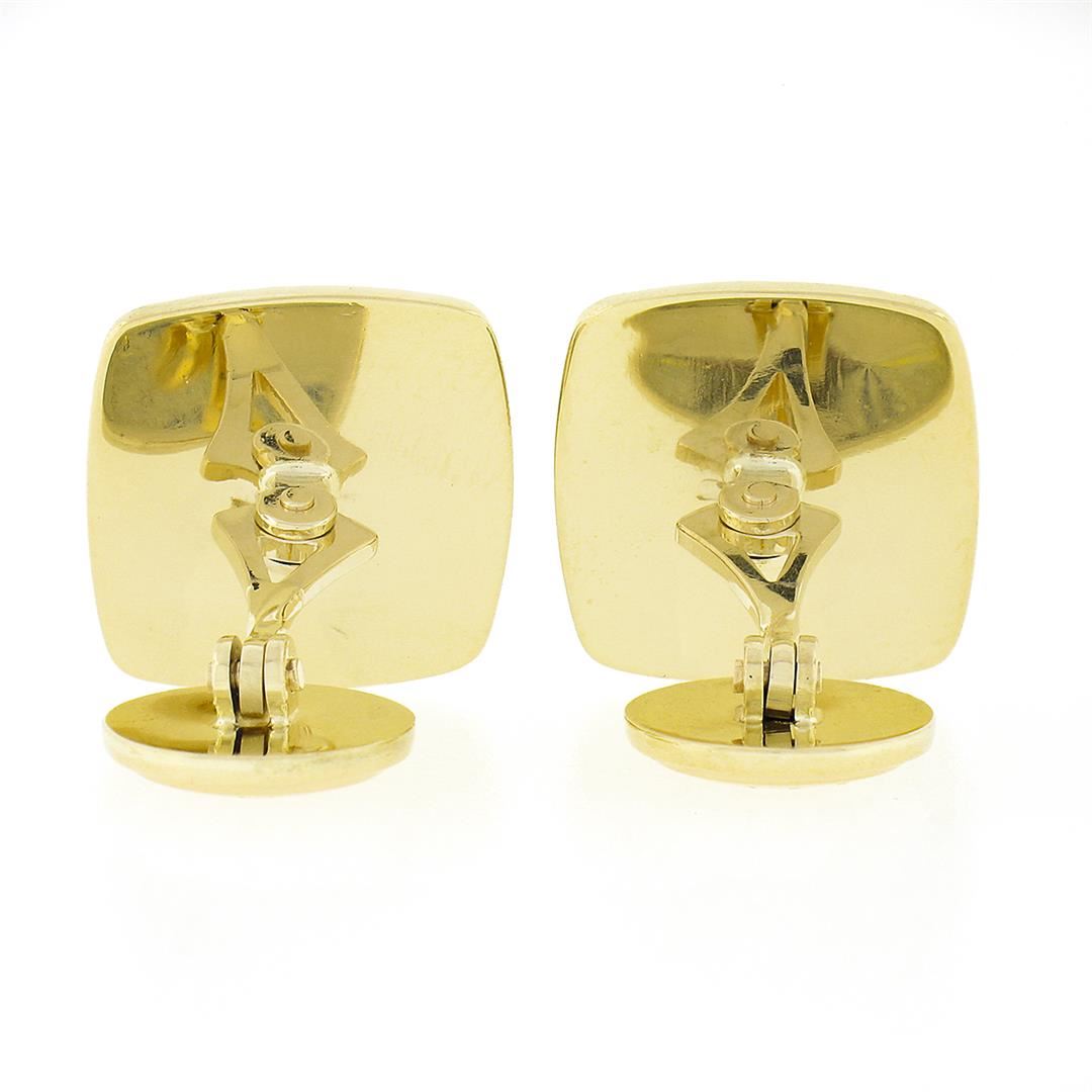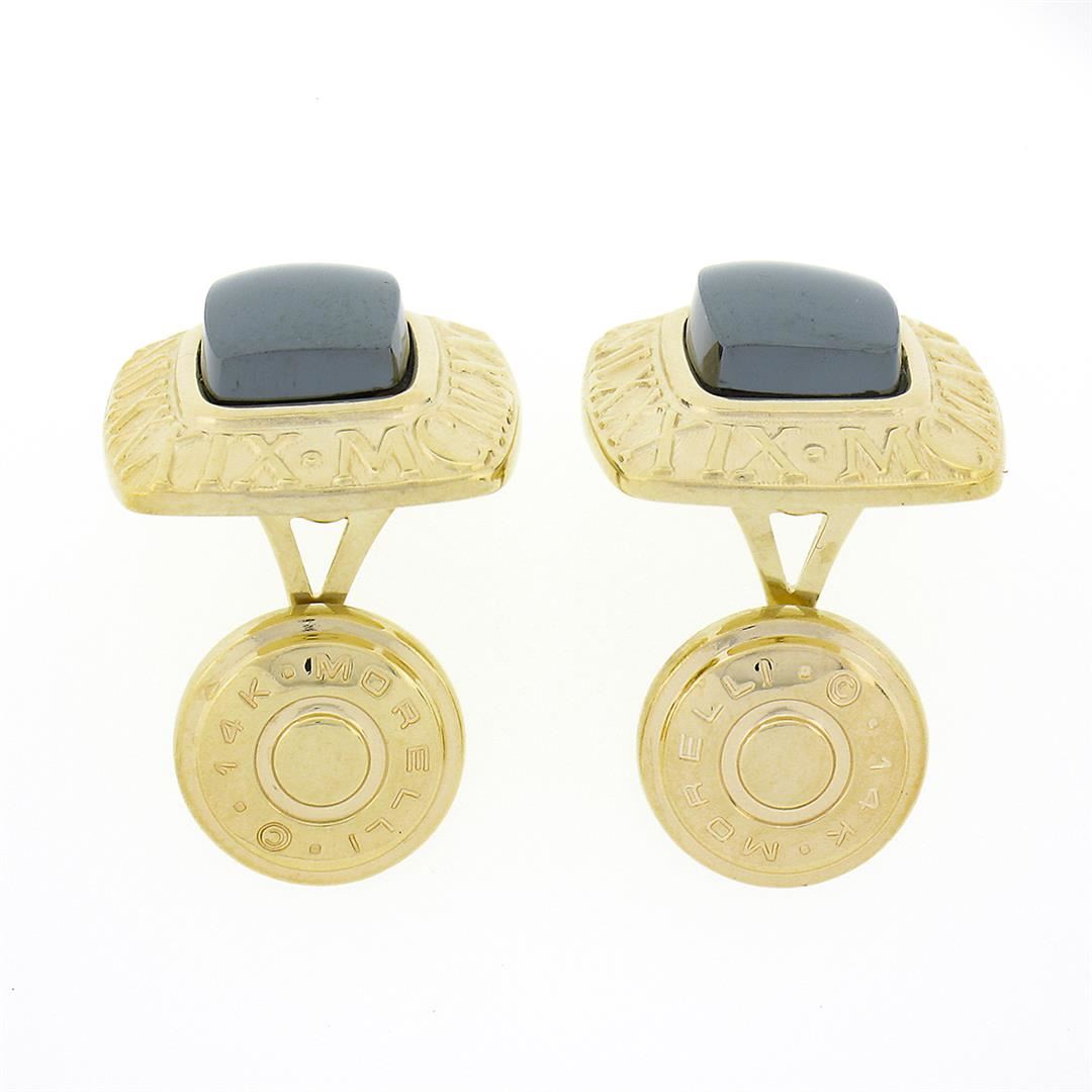 A solid 14k yellow gold cufflinks by Paul Morelli, with 2 cushion cabochon cut natural hematites (10.40x8.40mm). These cuff links have a swivel design with a clearance of 14.9mm, weigh a total of 10.14 grams, and the front panels measure 18.40x16.50mm.