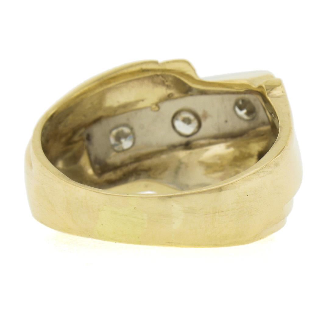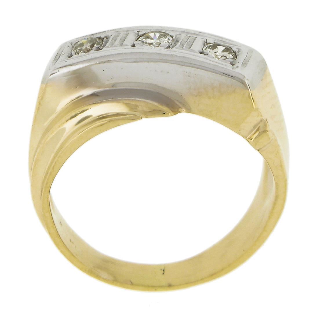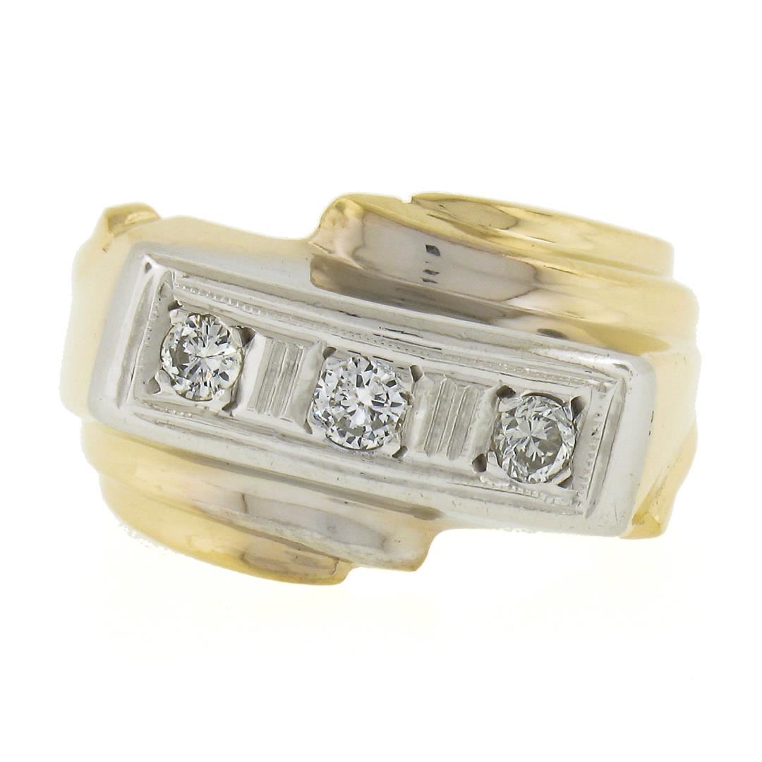 A vintage solid 14k yellow & white gold men's bypass band ring, with 3 round & old transitional cut natural diamonds ( J-L - SI1-I1 ; 0.25ctw). The ring is size 7.0, weighs a total of 6.63 grams, and measures 12.9mm wide.