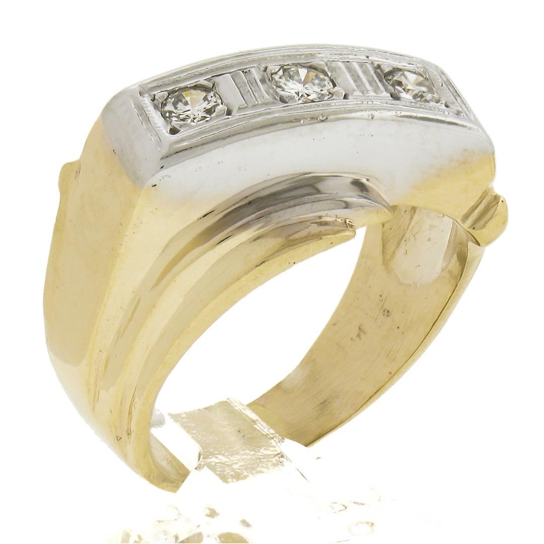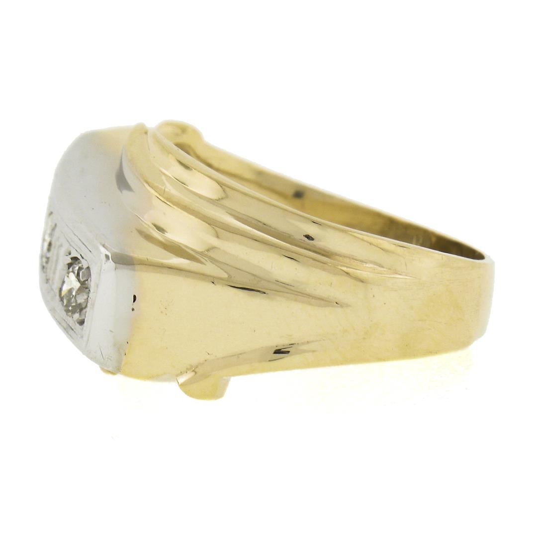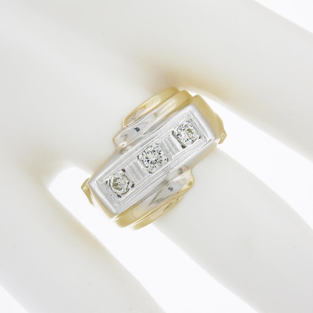A vintage solid 14k yellow & white gold men's bypass band ring, with 3 round & old transitional cut natural diamonds ( J-L - SI1-I1 ; 0.25ctw). The ring is size 7.0, weighs a total of 6.63 grams, and measures 12.9mm wide.