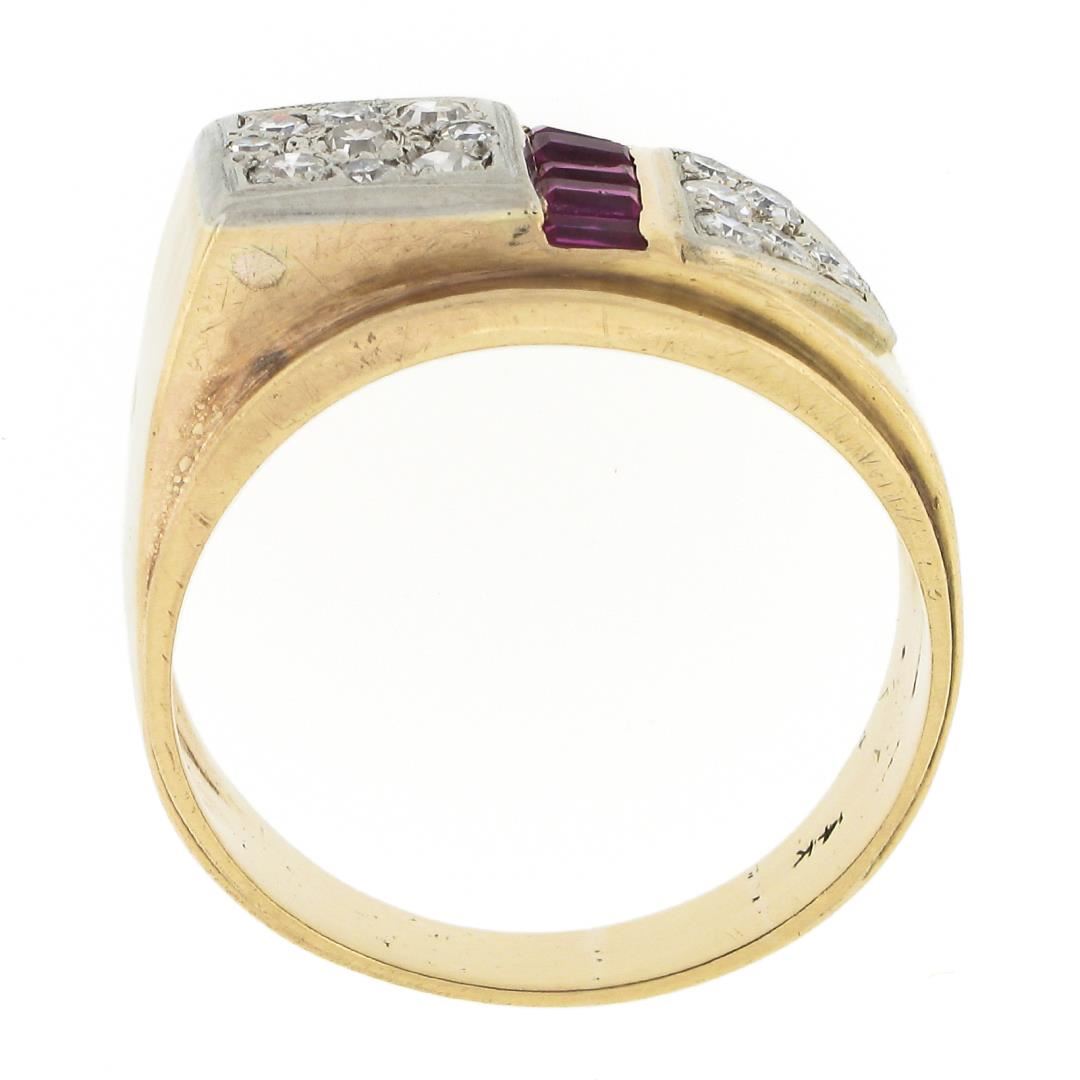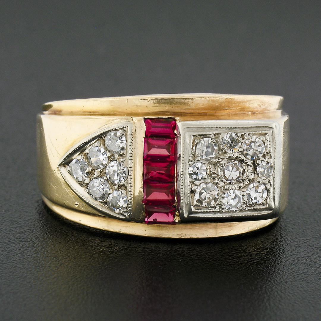 A vintage solid 14k yellow and white gold band ring, with 15 old single cut natural diamonds (G-I - VS2-SI2 ; 0.40ctw), and 5 baguette cut synthetic rubies. The ring is size 12.0, weighs a total of 9.04 grams, and measures 13.55mm wide.