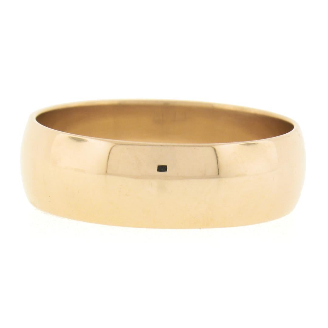 A solid 14k rosy yellow gold band ring. The ring is size 12.5, weighs a total of 7.47 grams, and measures 7.20mm wide.