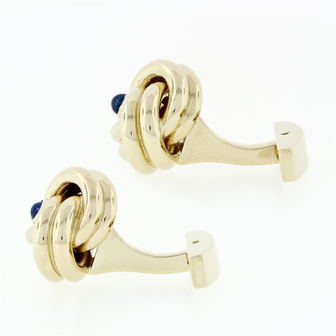 A solid 14k yellow gold cufflinks, with 2 round cabochon cut natural sapphires (3.05mm). These cuff links have a swivel design with a clearance of 11.1mm, weigh a total of 30.62 grams, and the front panels measure 16.0mm.