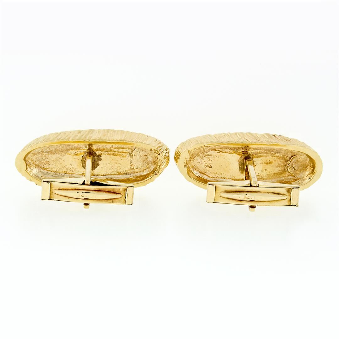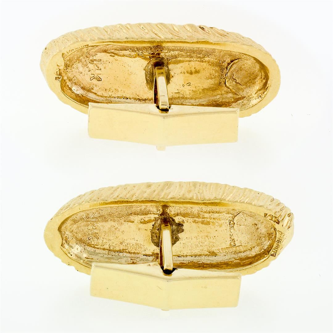 A pair of solid 14k yellow gold oval textured cufflinks. These cuff links have a swivel backs design with a clearance of 12.54mm, weigh a total of 15.41 grams, and the front panels measure 12.27x30.35mm.