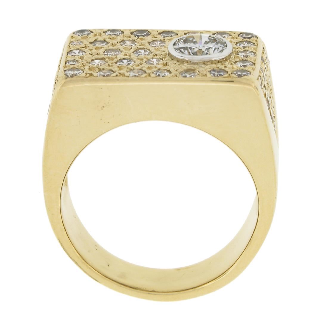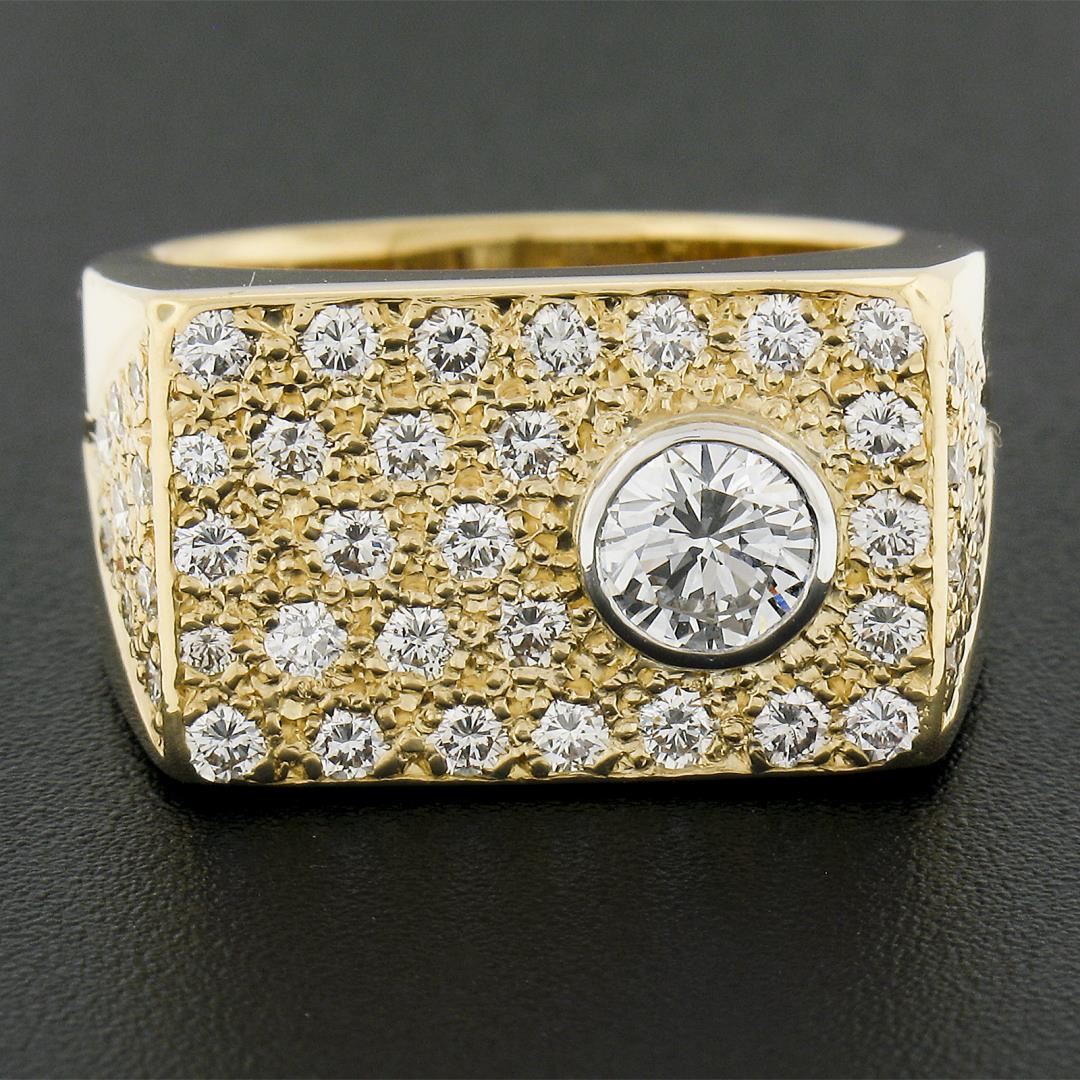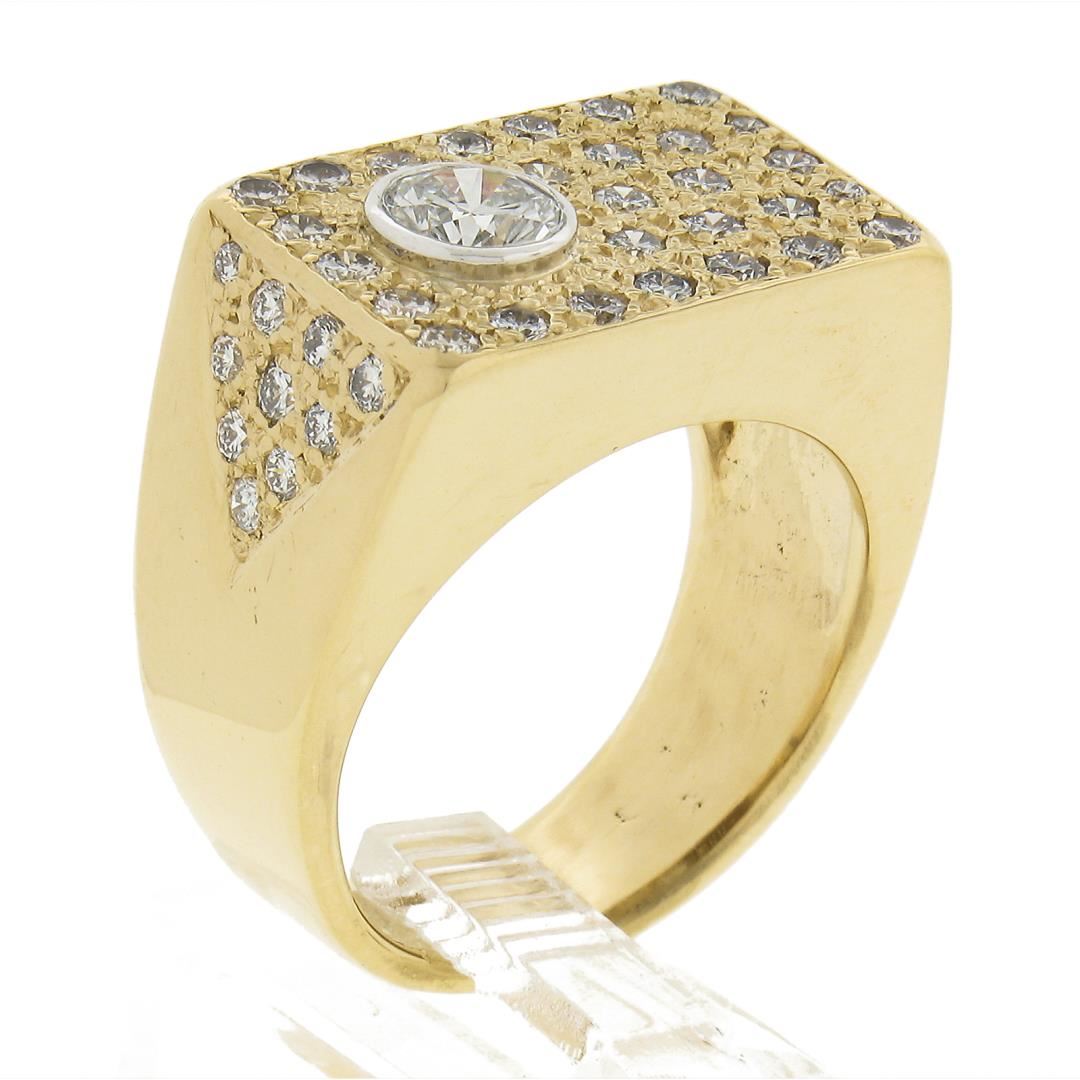 A solid 18k yellow gold wide ring, with 29 round cut natural diamonds (F/G - VS1-SI2 ; 0.87ctw). The ring is size 9.0, weighs a total of 18.28 grams, and measures 12.4mm wide.