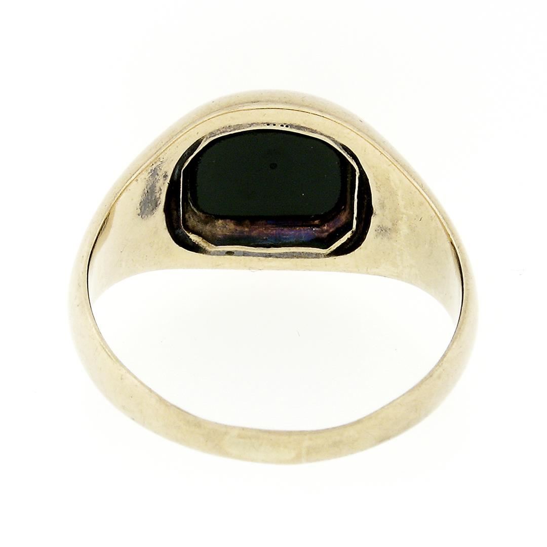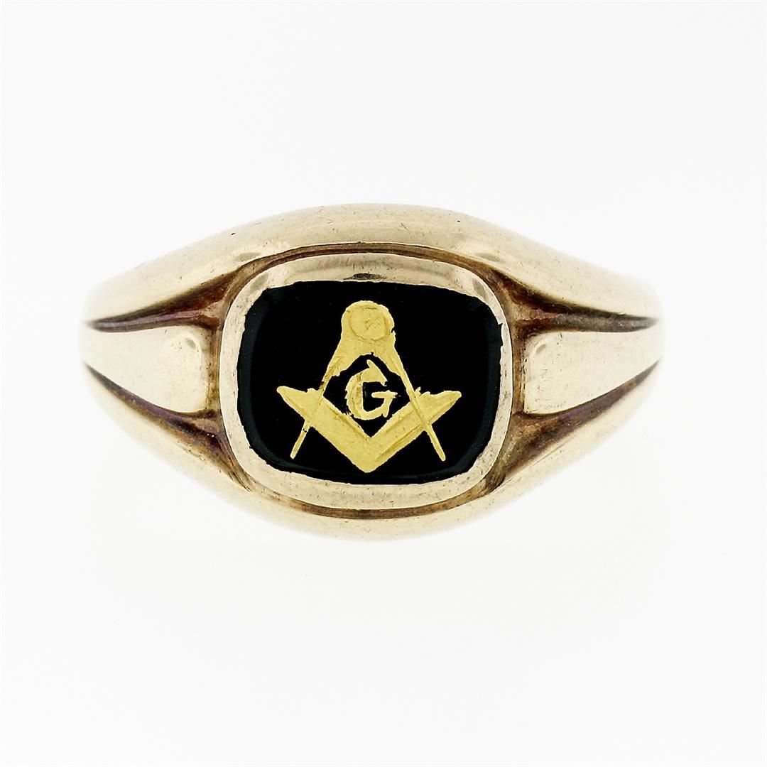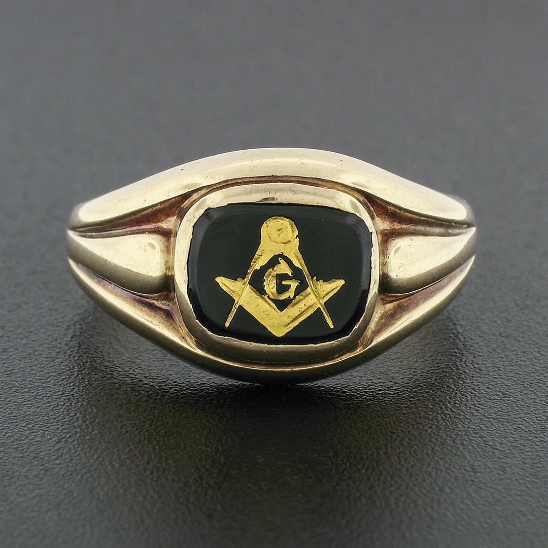 A vintage solid 10k yellow gold men's masonic ring, with 1 cushion cabochon cut natural black onyx (9.65x7.2mm). The ring is size 11, weighs a total of 5.43 grams, and measures 12.85mm wide.