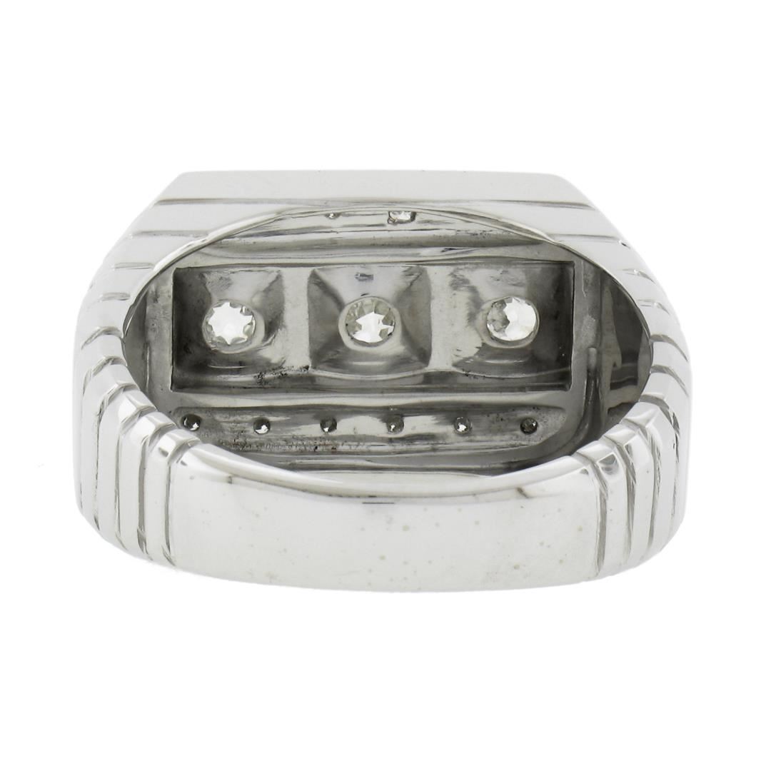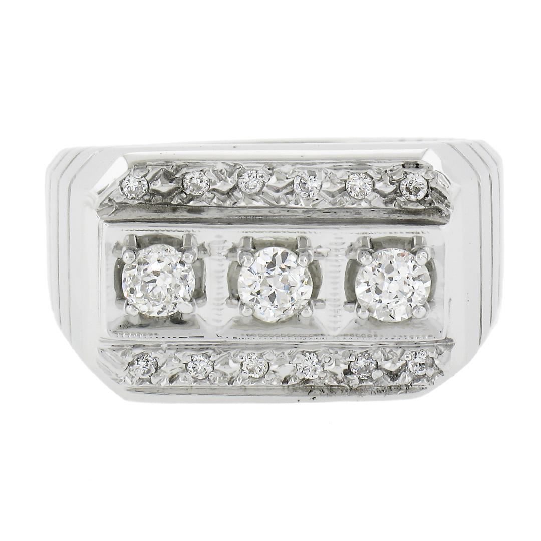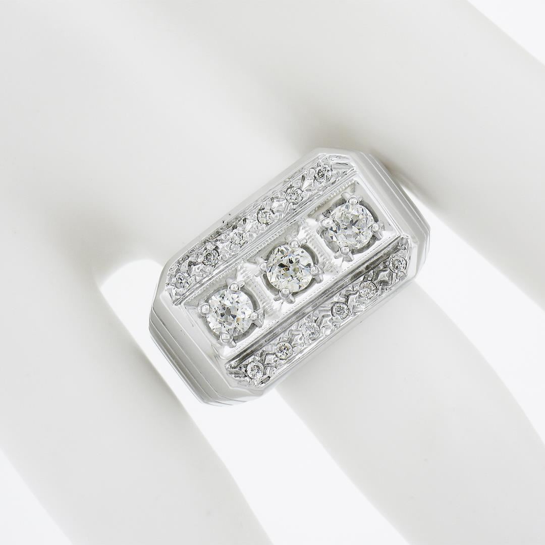 A vintage solid 14k white gold wide band ring, with 3 old european cut natrual diamonds (I/J - VS2-SI2 ; 0.60ctw), with 12 round & single cut natural diamonds (H-J - SI2/I1 ; 0.10ctw). The ring is size 10.0, weighs a total of 9.09 grams, and measures 12.8mm wide.