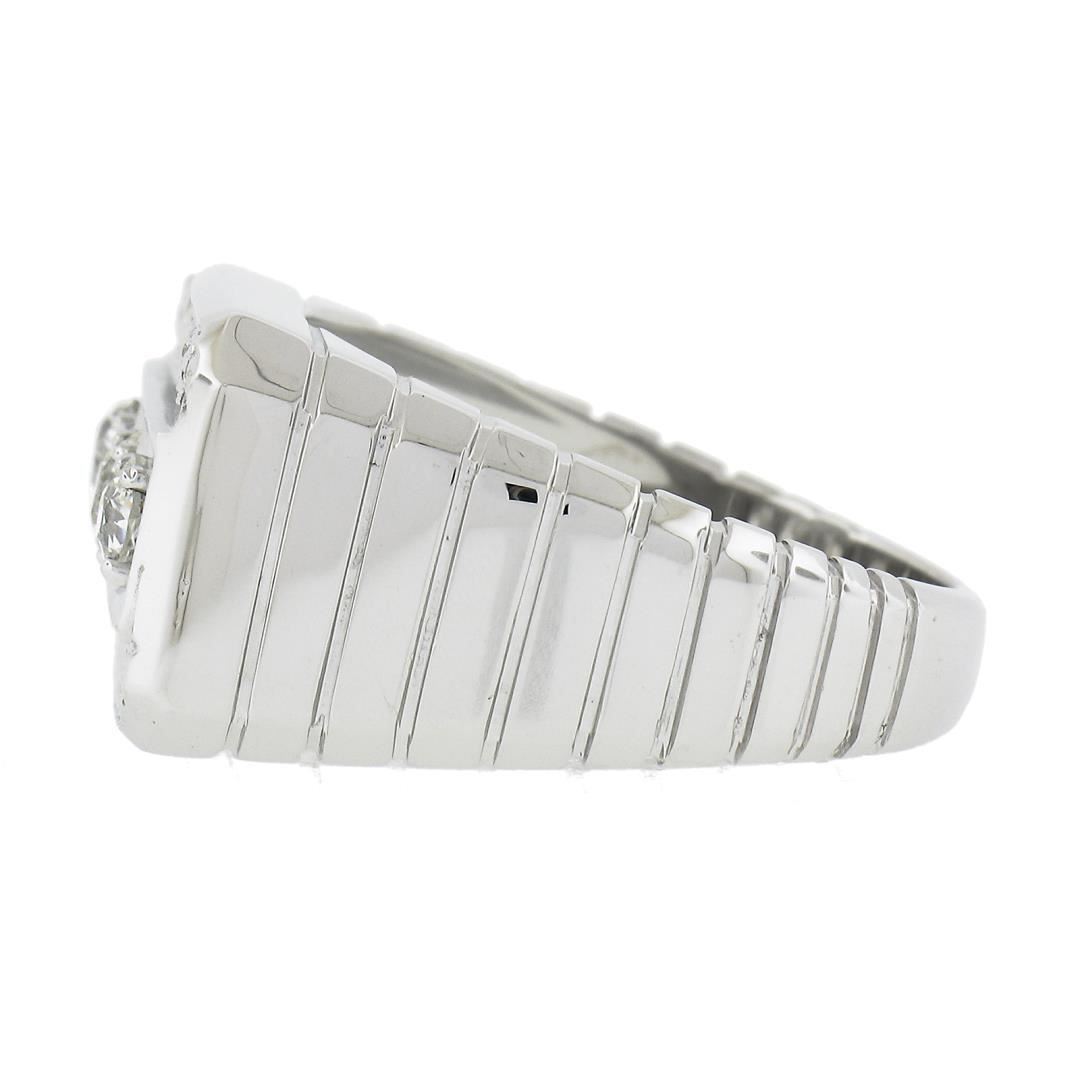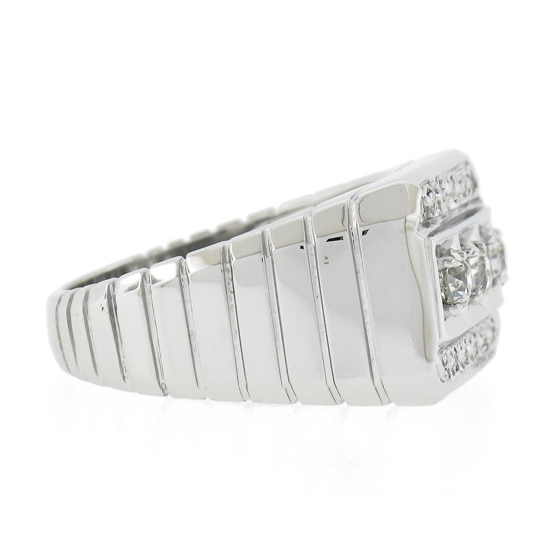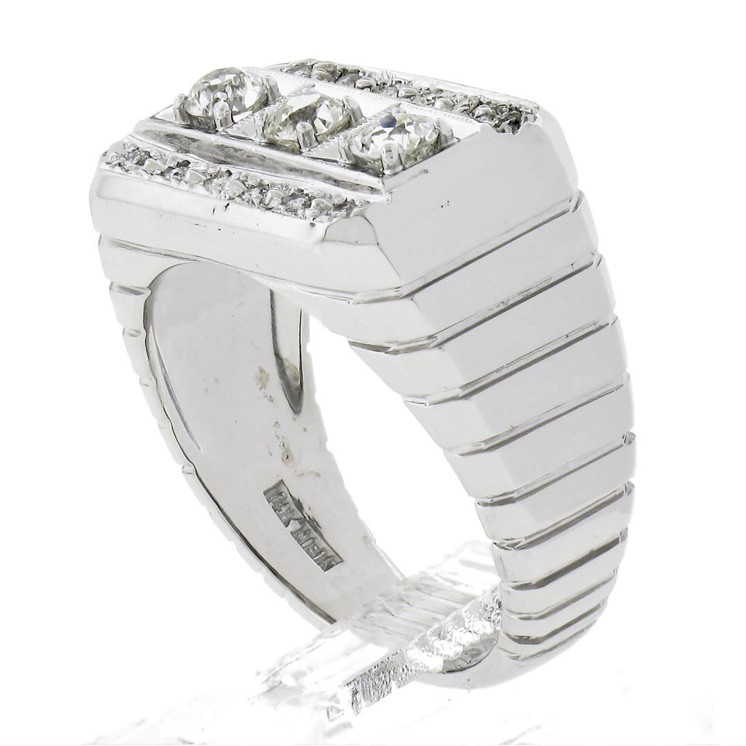 A vintage solid 14k white gold wide band ring, with 3 old european cut natrual diamonds (I/J - VS2-SI2 ; 0.60ctw), with 12 round & single cut natural diamonds (H-J - SI2/I1 ; 0.10ctw). The ring is size 10.0, weighs a total of 9.09 grams, and measures 12.8mm wide.