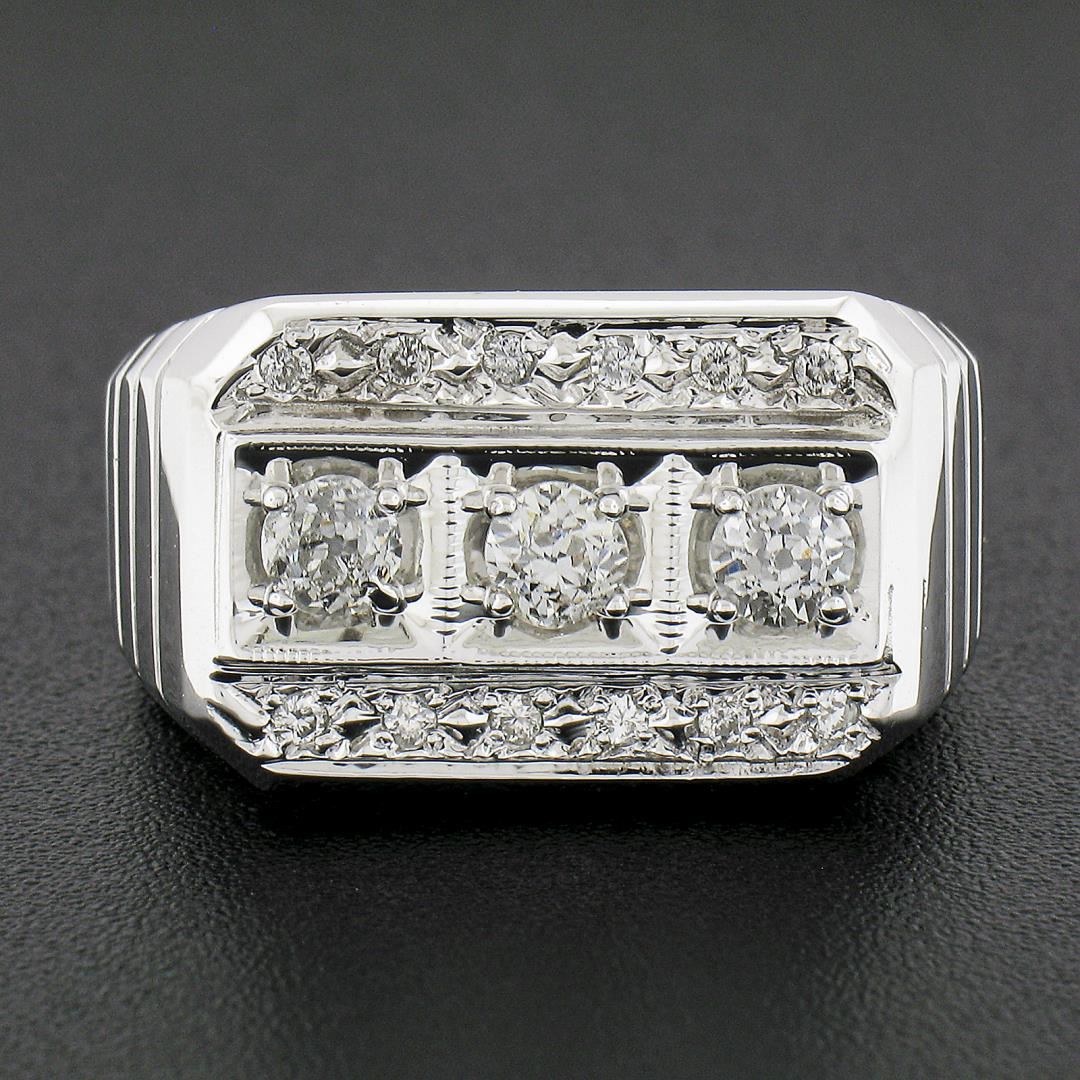 A vintage solid 14k white gold wide band ring, with 3 old european cut natrual diamonds (I/J - VS2-SI2 ; 0.60ctw), with 12 round & single cut natural diamonds (H-J - SI2/I1 ; 0.10ctw). The ring is size 10.0, weighs a total of 9.09 grams, and measures 12.8mm wide.