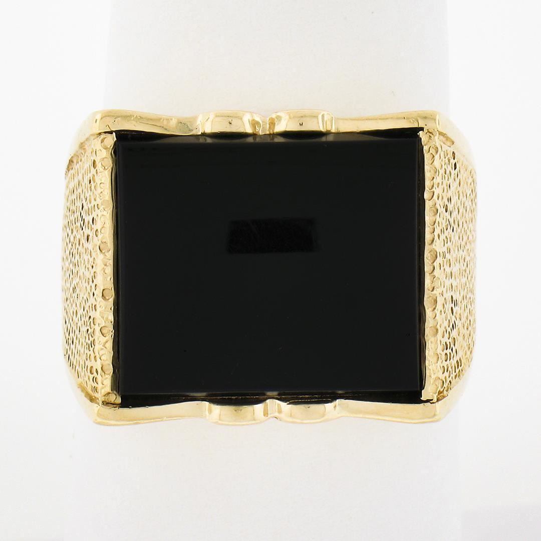 A vintage solid 14k yellow goldd wide men's ring, with 1 rectangular cut natrual black onyx (13.90x12mm). The ring is size 7.5, weighs a total of 7.46 grams, and measures 14.55mm wide.