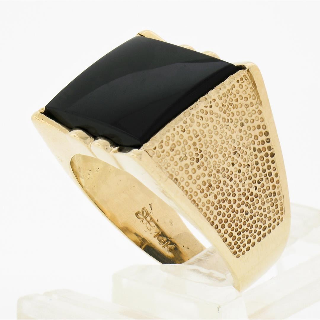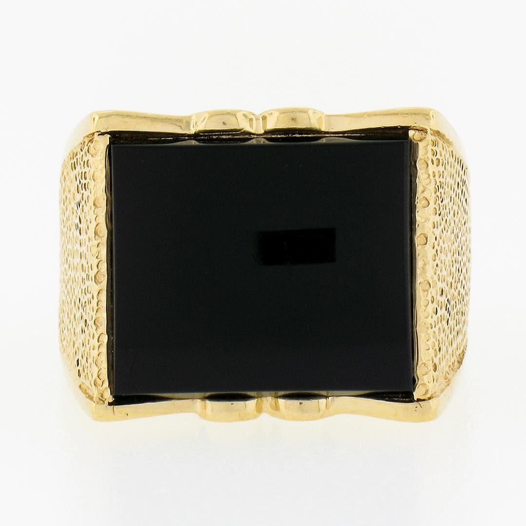 A vintage solid 14k yellow goldd wide men's ring, with 1 rectangular cut natrual black onyx (13.90x12mm). The ring is size 7.5, weighs a total of 7.46 grams, and measures 14.55mm wide.