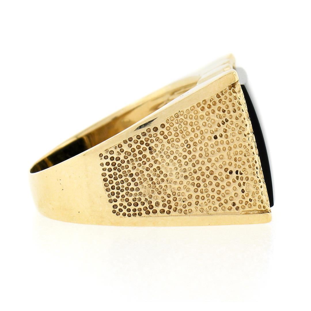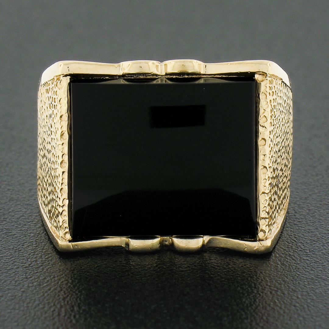 A vintage solid 14k yellow goldd wide men's ring, with 1 rectangular cut natrual black onyx (13.90x12mm). The ring is size 7.5, weighs a total of 7.46 grams, and measures 14.55mm wide.