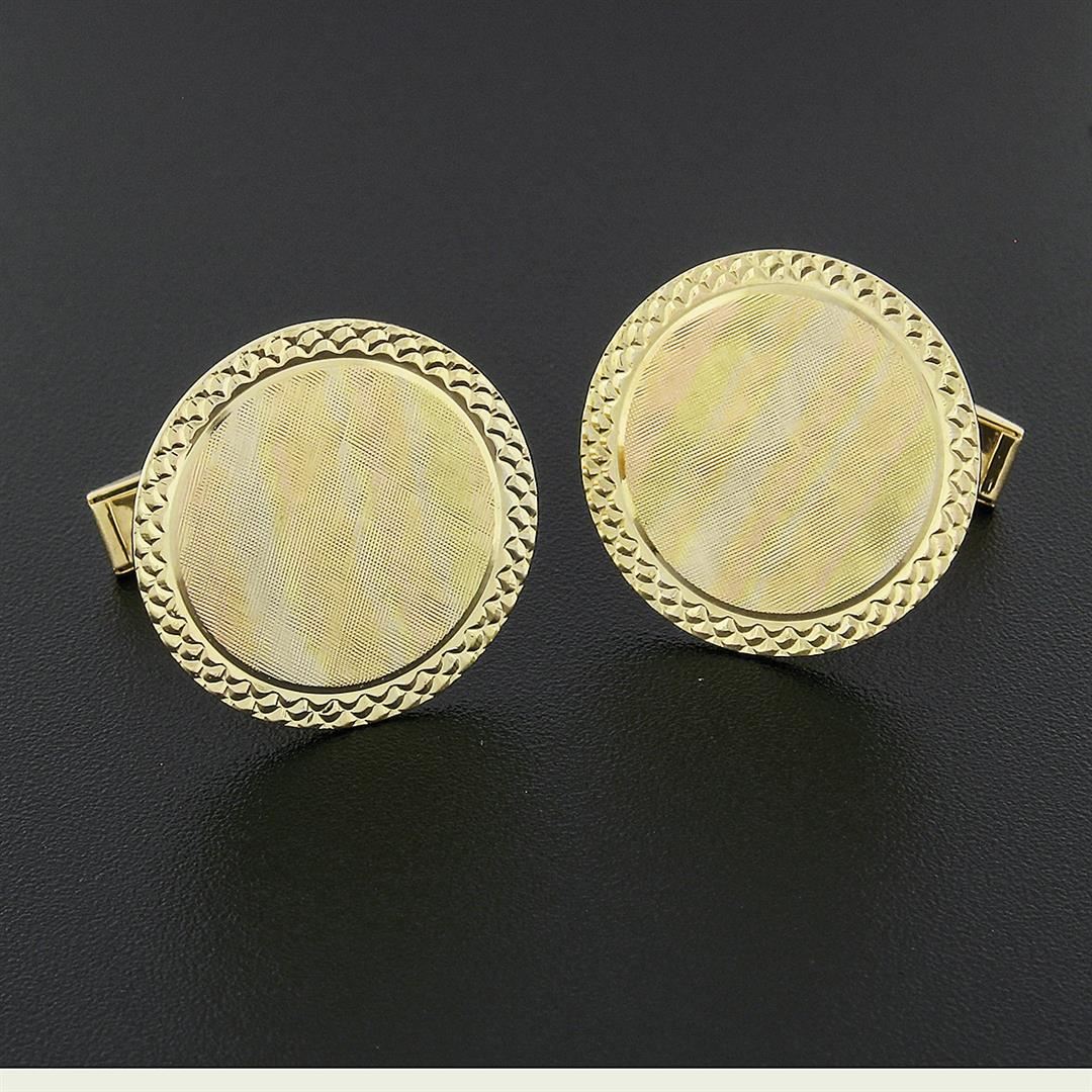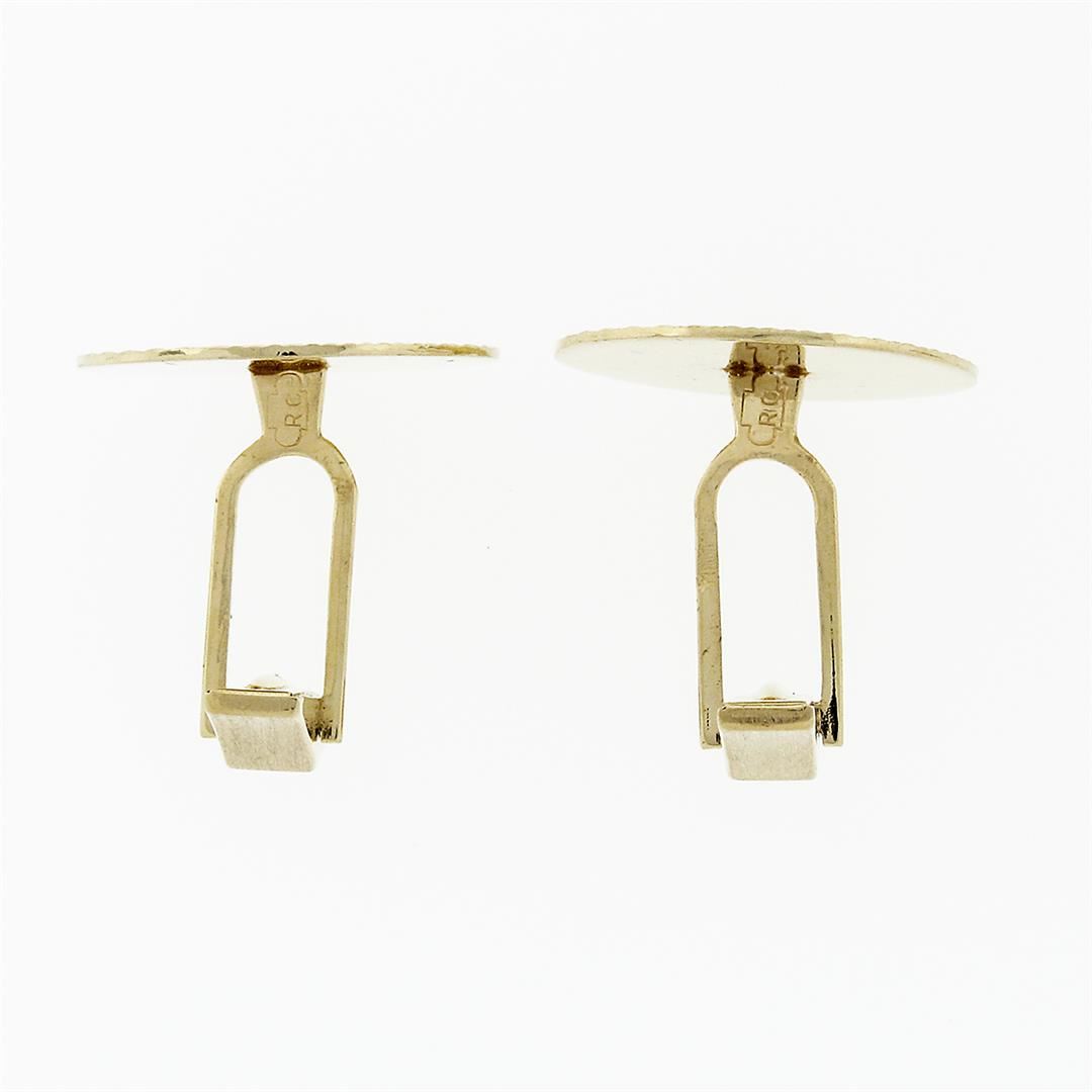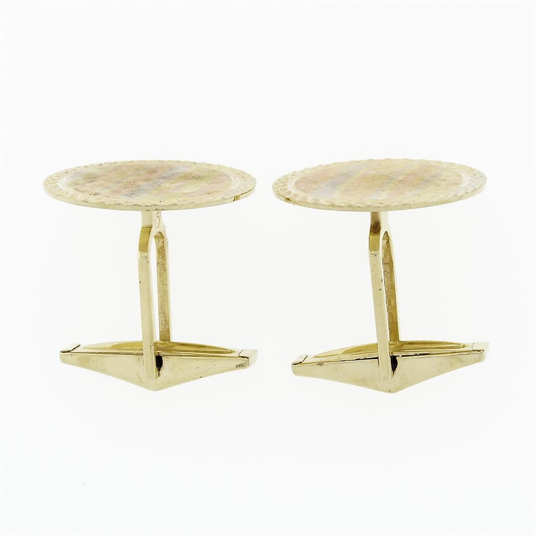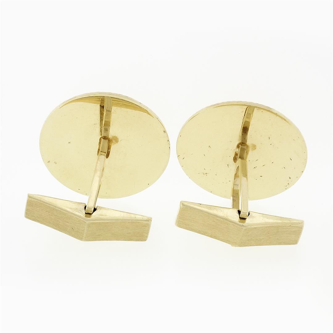 A vintage solid 14k yellow gold cufflinks. These cuff links have a swivel design with a clearance of 14.65mm, weigh a total of 8.28 grams, and the front panels measure 19.25mm.