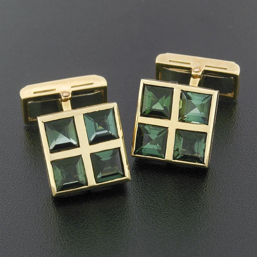 A vintage solid 18k yellow gold square grid cufflinks, with 12 square step cut natural tourmalines (5.0x5.0mm - 5.0ctw). These cuff links have a swivel design with a clearance of 15.75mm, weigh a total of 16.53 grams, and the front panels measure 12.35x12.35mm.