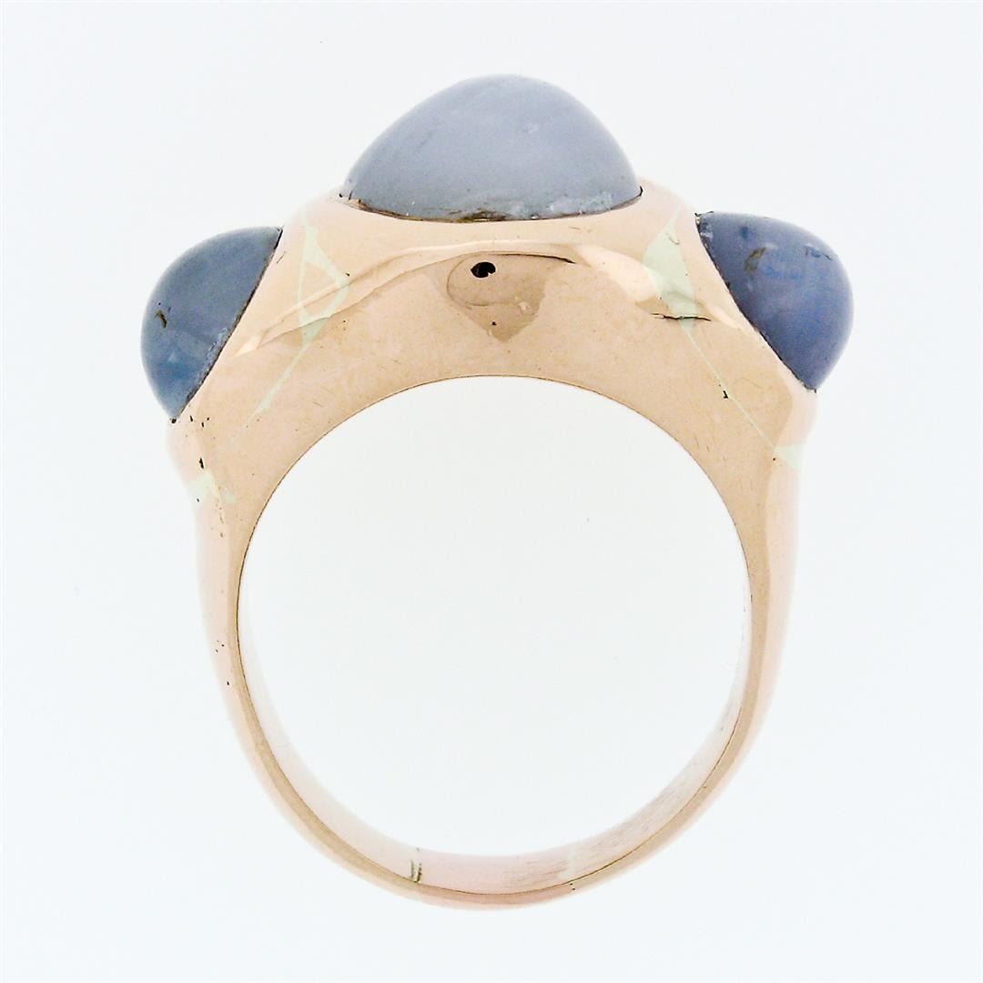 A solid 14k rose gold men's ring, with 3 oval double cabochon cut natural star sapphires (34.25 ctw). The ring is size 10.5, weighs a total of 22.04 grams, and measures 16.15mm wide.