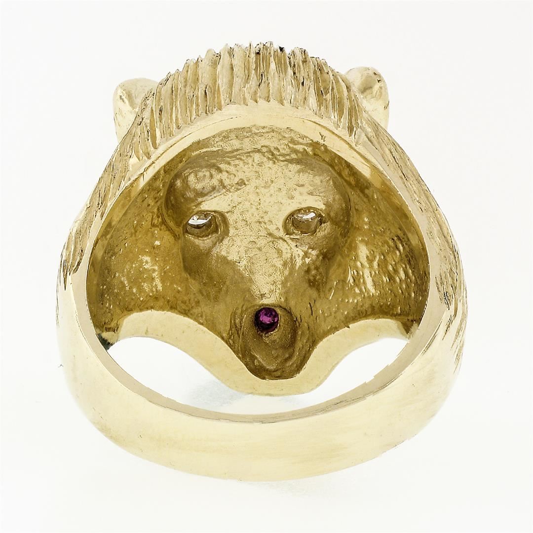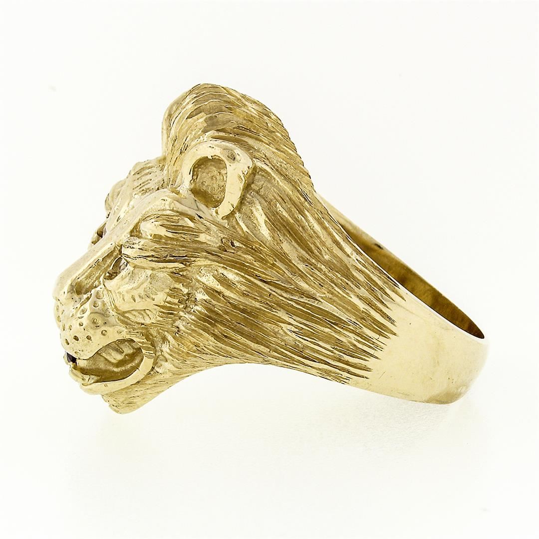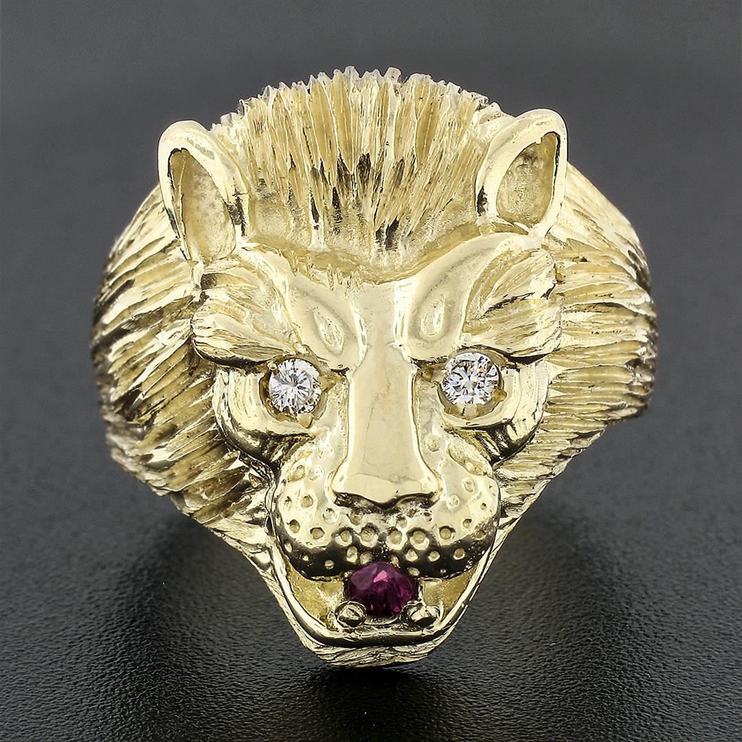 A vintage solid 14k yellow gold men's lion ring, with 2 round brilliant cut natural diamonds (H - VS1 ; 0.10ctw,) and 1 round brilliant cut natural ruby (0.07ct). The ring is size 10, weighs a total of 24.06 grams, and measures 23.97mm wide.