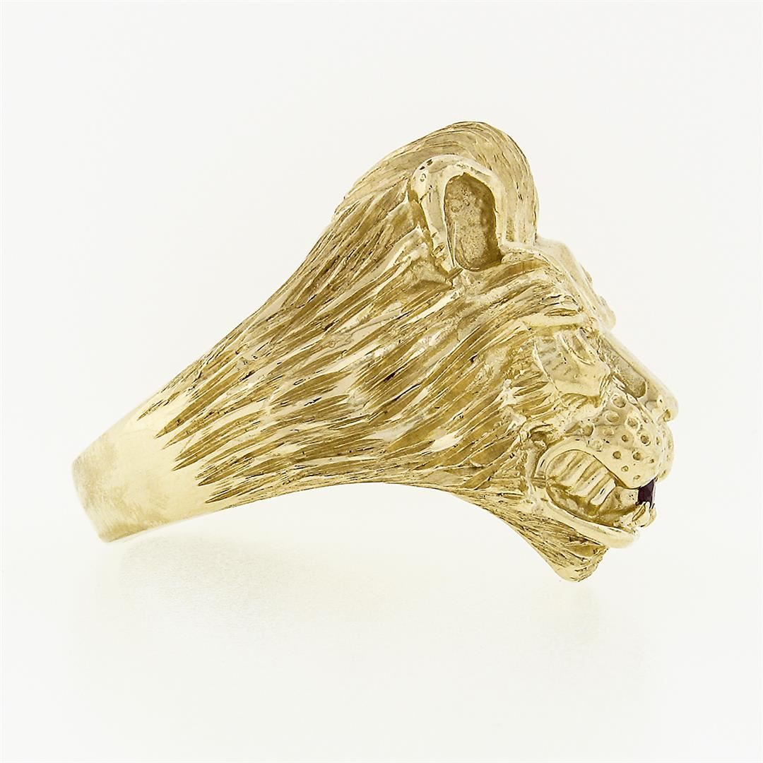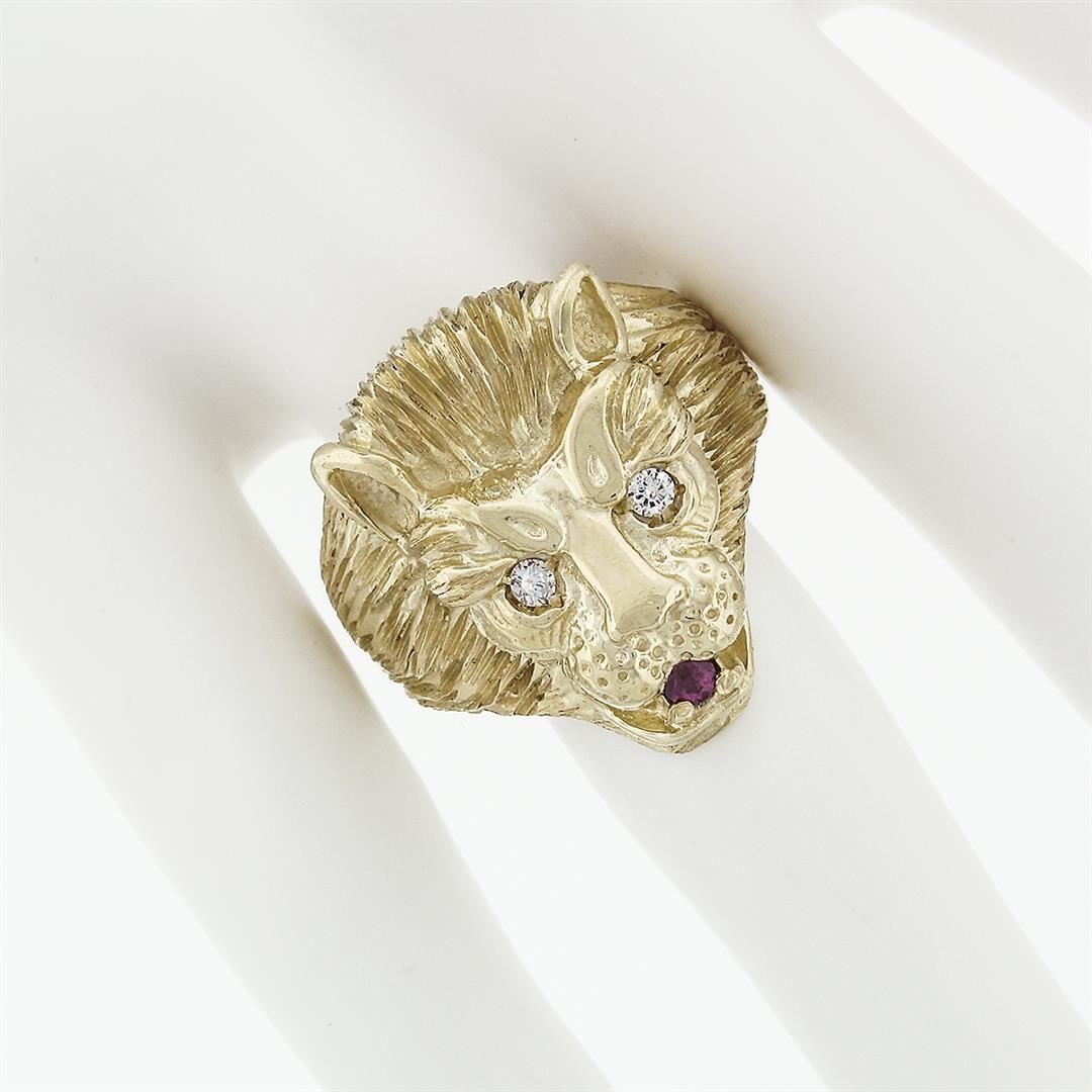 A vintage solid 14k yellow gold men's lion ring, with 2 round brilliant cut natural diamonds (H - VS1 ; 0.10ctw,) and 1 round brilliant cut natural ruby (0.07ct). The ring is size 10, weighs a total of 24.06 grams, and measures 23.97mm wide.