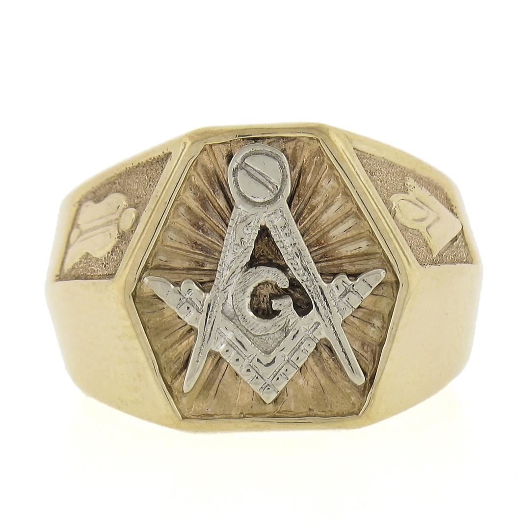 Men's Vintage Solid 10K Yellow & White Gold Detailed Masonic Wide Band Ring