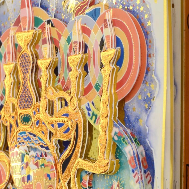 "Menorah" is a limited edition 3-layer decoupage by Raphael Abecassis, numbered and hand signed by the artist. This decoupage is nested in a display box, and can be framed with or without this box. Includes Certificate of Authenticity! Measures approx. 15" x 19.5" (with box), 14.5" x 19" (image).