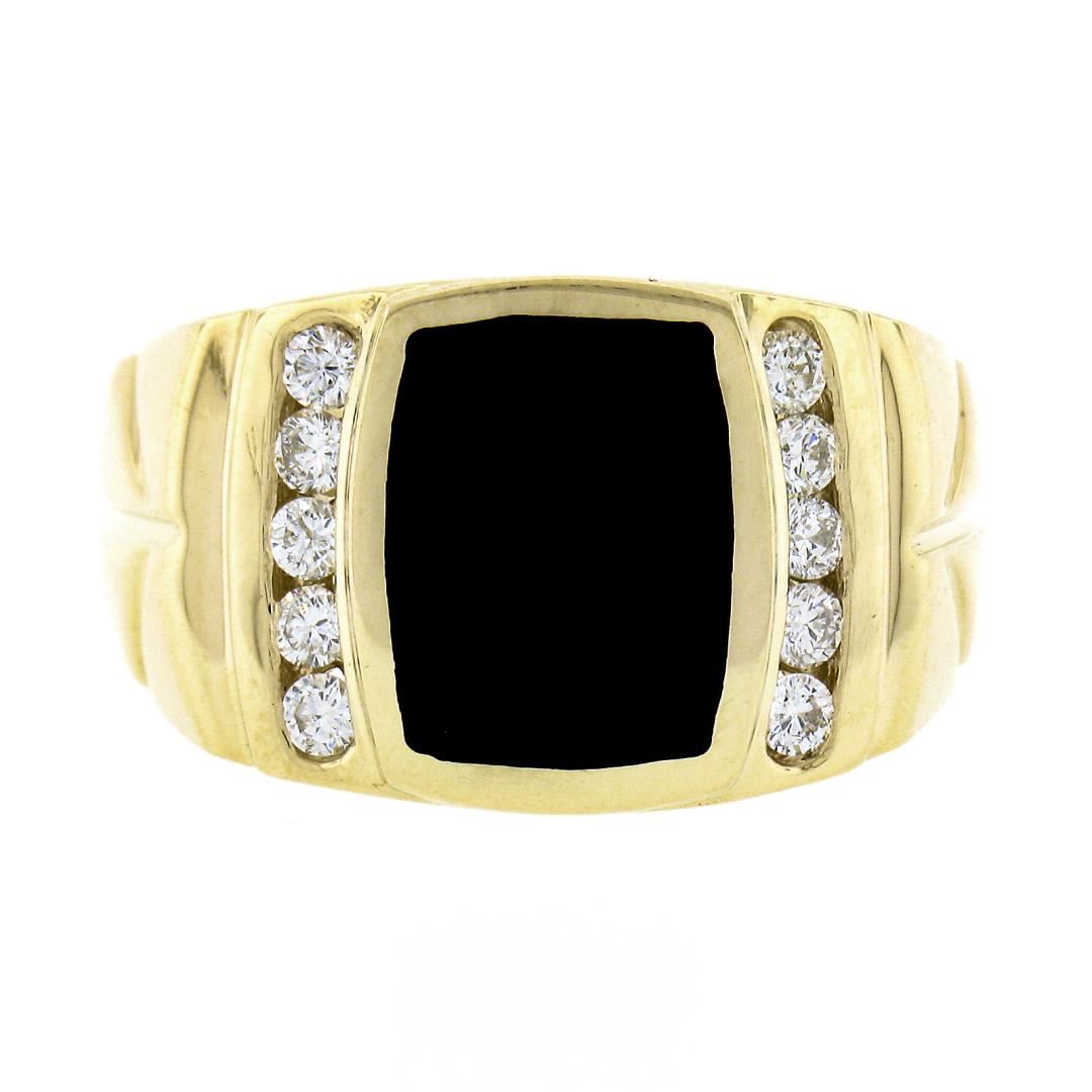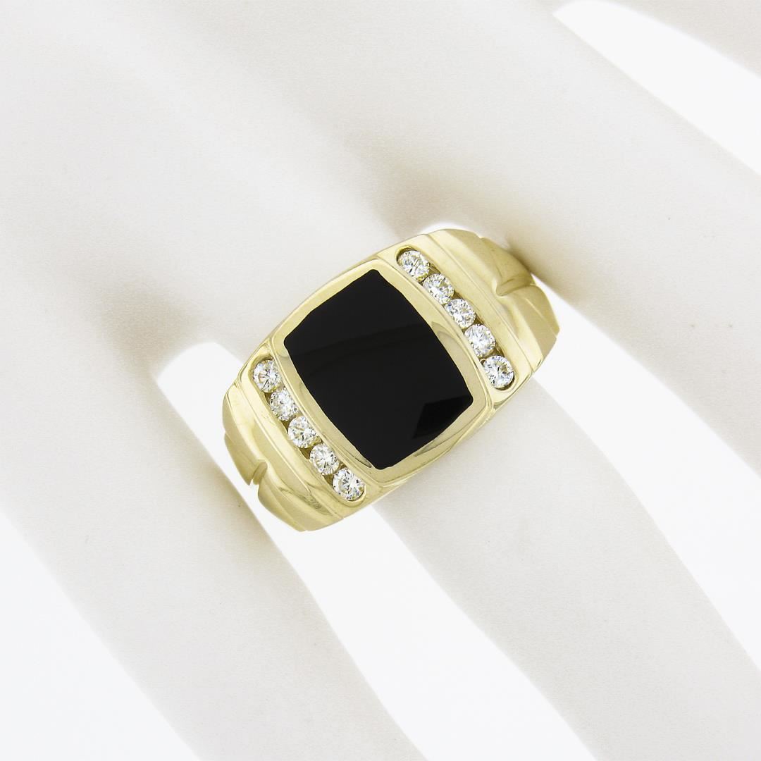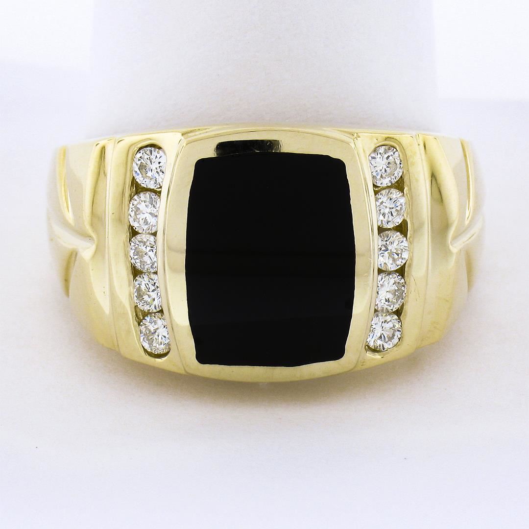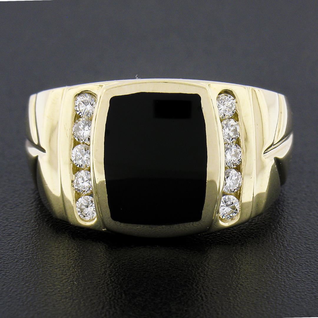 A solid 14k yellow gold mens wide ring, with 1 cushiony rectangular cut natural black onyx (11.7x9mm), and 10 round brilliant cut natural diamonds (E/F - VS1/VS2 ; 0.35ctw). The ring is size 12.0, weighs a total of 10.30 grams, and measures 14mm wide.
