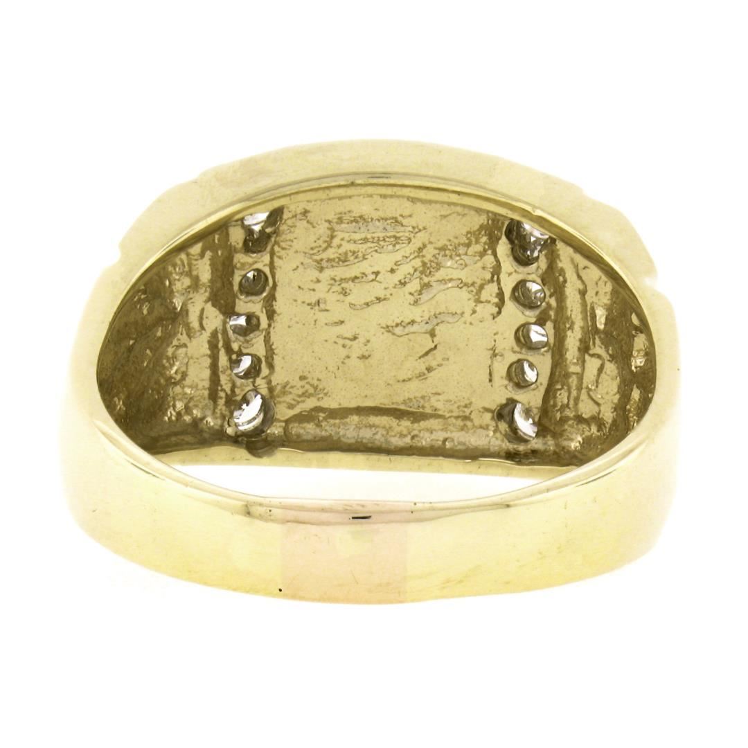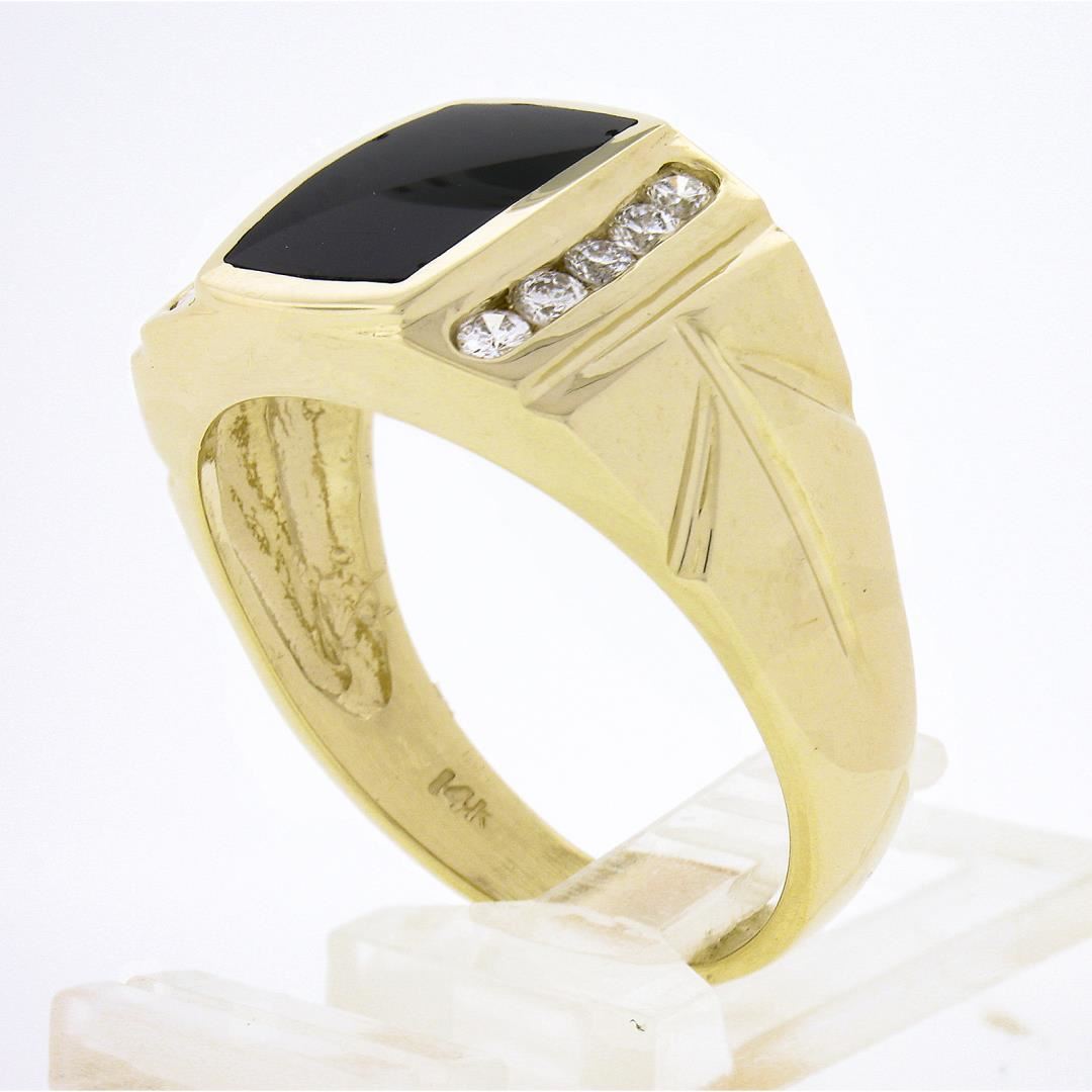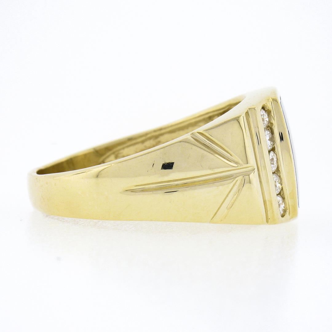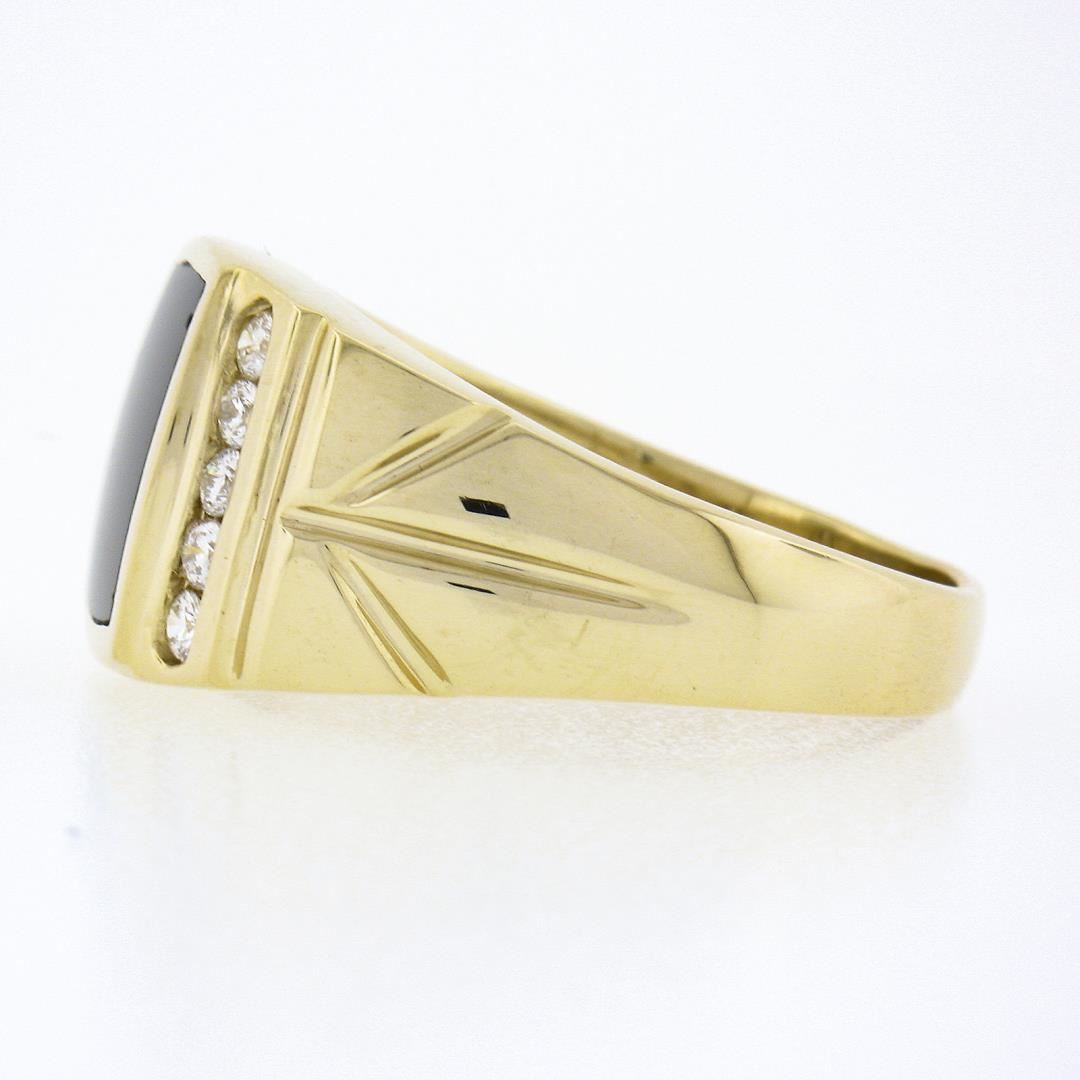 A solid 14k yellow gold mens wide ring, with 1 cushiony rectangular cut natural black onyx (11.7x9mm), and 10 round brilliant cut natural diamonds (E/F - VS1/VS2 ; 0.35ctw). The ring is size 12.0, weighs a total of 10.30 grams, and measures 14mm wide.