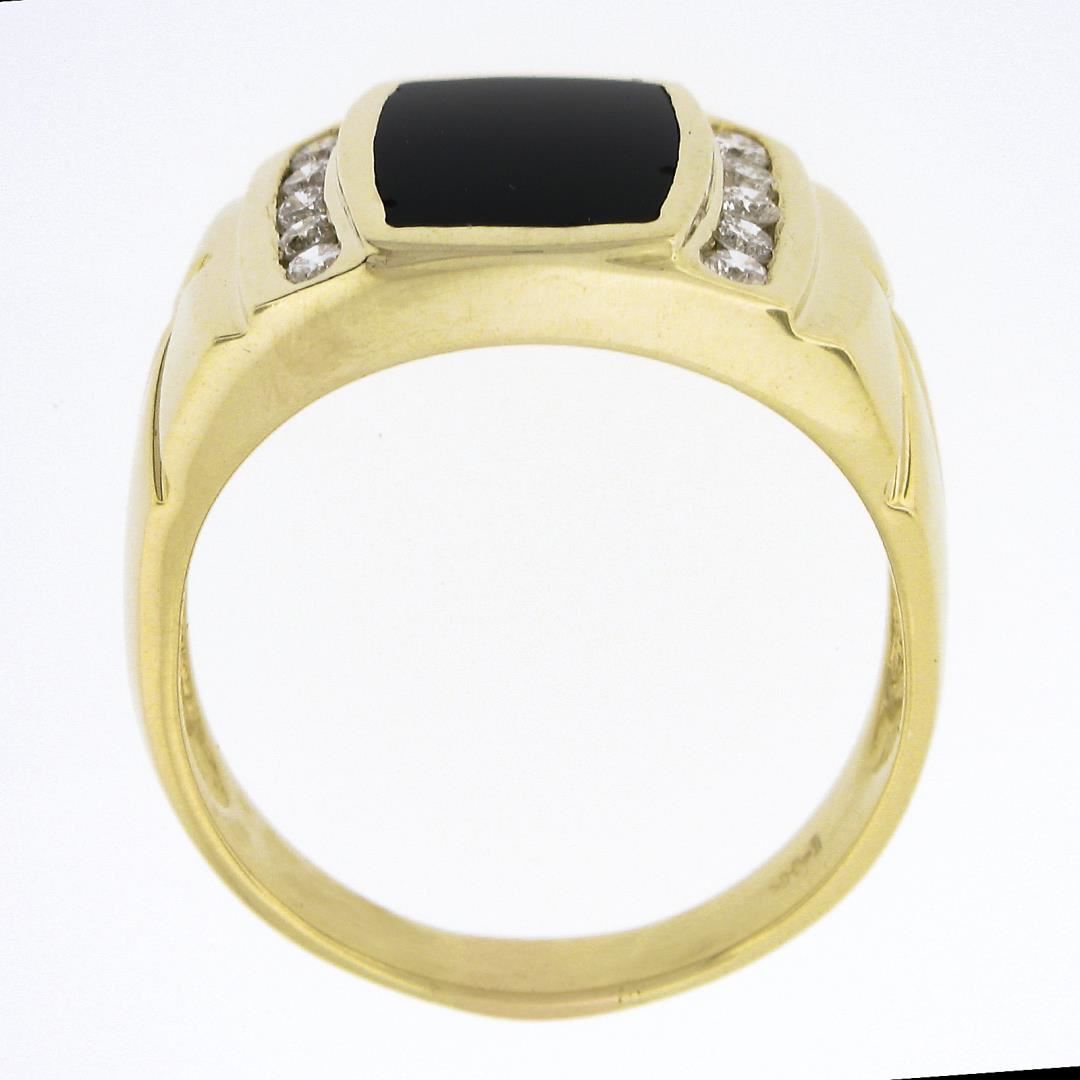 A solid 14k yellow gold mens wide ring, with 1 cushiony rectangular cut natural black onyx (11.7x9mm), and 10 round brilliant cut natural diamonds (E/F - VS1/VS2 ; 0.35ctw). The ring is size 12.0, weighs a total of 10.30 grams, and measures 14mm wide.