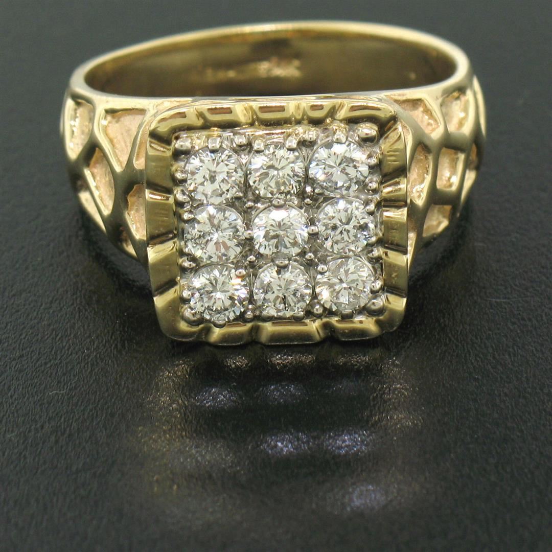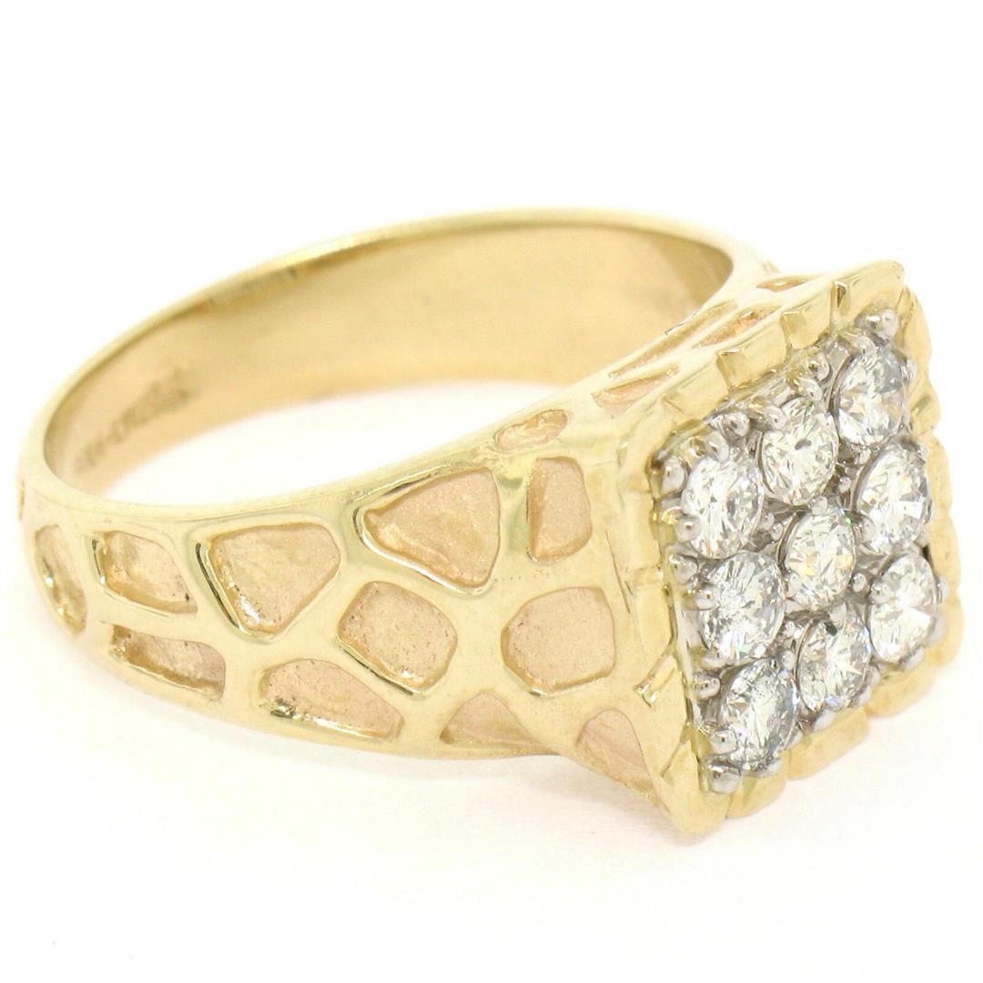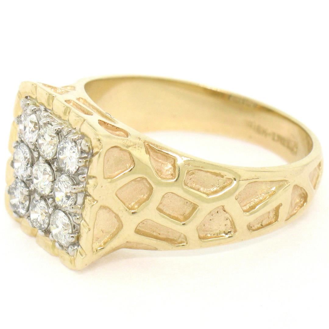One Men's 14K Two Tone Gold Nugget Design .90ctw Round BRILLIANT Diamond Cluster Ring. Item Details: Material: 14K Solid Yellow Gold, Weight: 8.59 Grams, Stone(s): (9) Natural Genuine Diamonds - Round Brilliant Cut - Prong Set - F/G Color - VS2 Clarity, Total Carat Weight: 0.90 (approx.), Ring Size: 9.5 , Ring Width: 13.20mm, Ring Height: 5.9mm rise off the finger, Condition: Like New!
