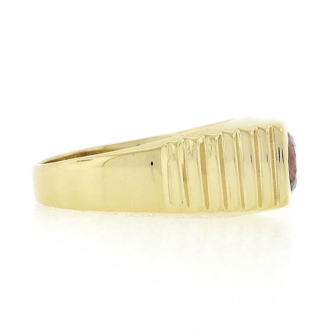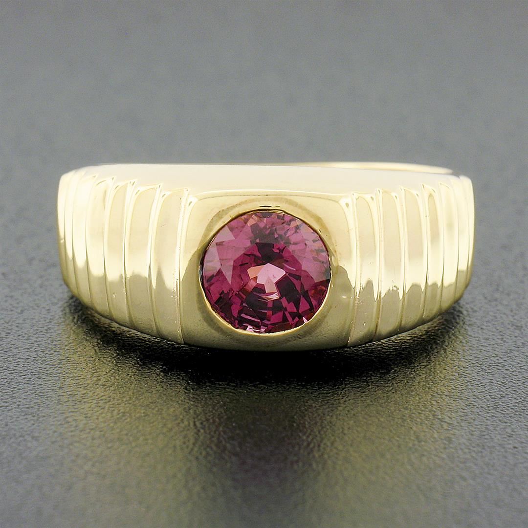 A solid 14k yellow gold solitaire grooved band ring, with 1 round cut natural garnet (6.6mm - 1.50ct). The ring is size 10.5, weighs a total of 7.57 grams, and measures 9.80mm wide.