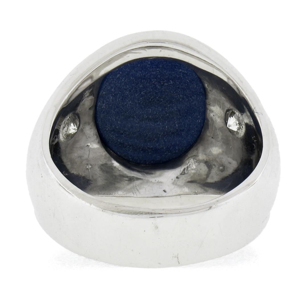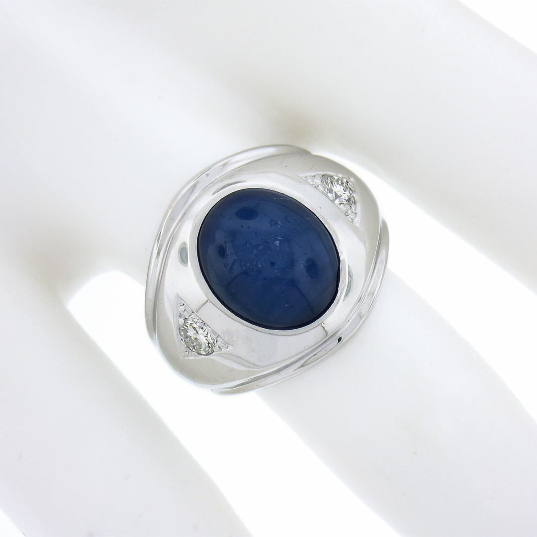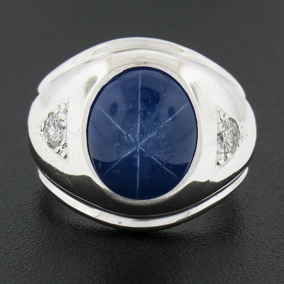 A solid 14k white gold pinky ring, with 1 oval cabochon cut synthetic star sapphire (10.9x9.1mm ), and 2 round cut natural diamonds (H/I - VS1/VS2 ; 0.24ctw). The ring is size 6.5, weighs a total of 8.73 grams, and measures 16.8mm wide.