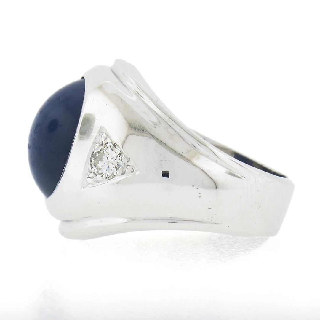 A solid 14k white gold pinky ring, with 1 oval cabochon cut synthetic star sapphire (10.9x9.1mm ), and 2 round cut natural diamonds (H/I - VS1/VS2 ; 0.24ctw). The ring is size 6.5, weighs a total of 8.73 grams, and measures 16.8mm wide.