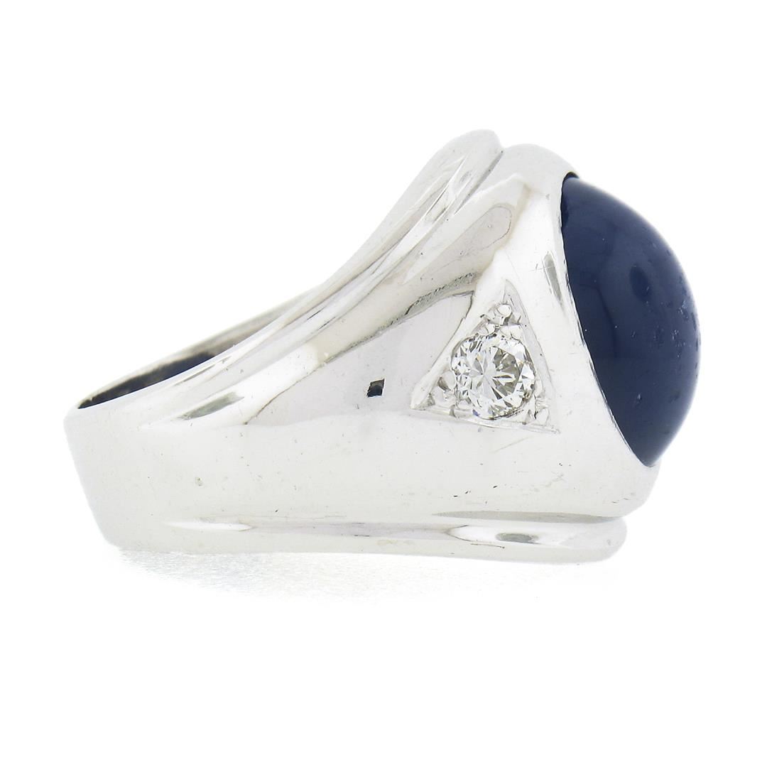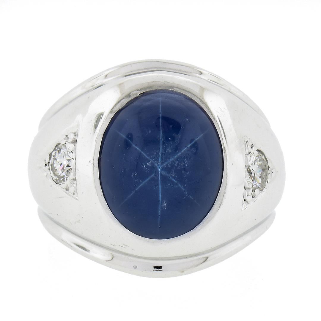 A solid 14k white gold pinky ring, with 1 oval cabochon cut synthetic star sapphire (10.9x9.1mm ), and 2 round cut natural diamonds (H/I - VS1/VS2 ; 0.24ctw). The ring is size 6.5, weighs a total of 8.73 grams, and measures 16.8mm wide.