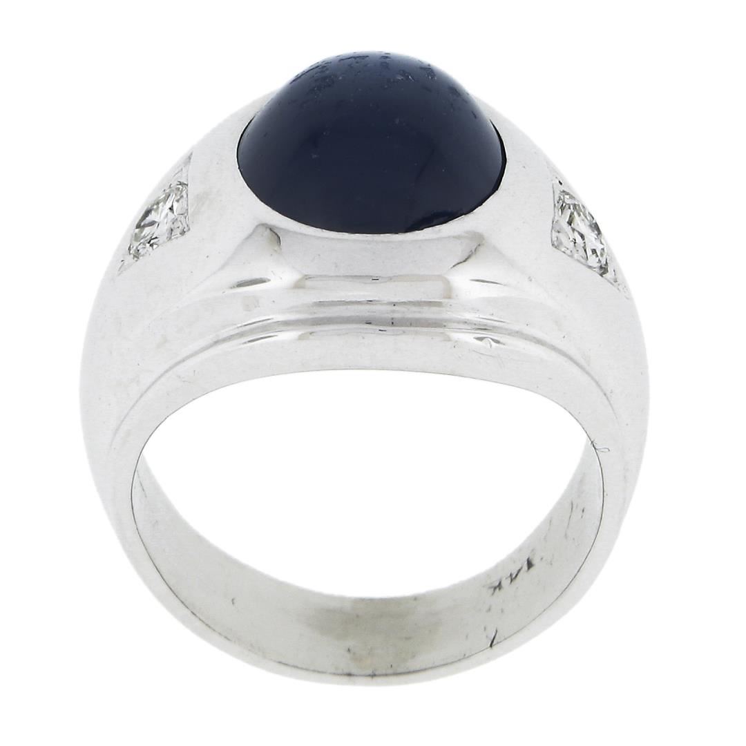 A solid 14k white gold pinky ring, with 1 oval cabochon cut synthetic star sapphire (10.9x9.1mm ), and 2 round cut natural diamonds (H/I - VS1/VS2 ; 0.24ctw). The ring is size 6.5, weighs a total of 8.73 grams, and measures 16.8mm wide.