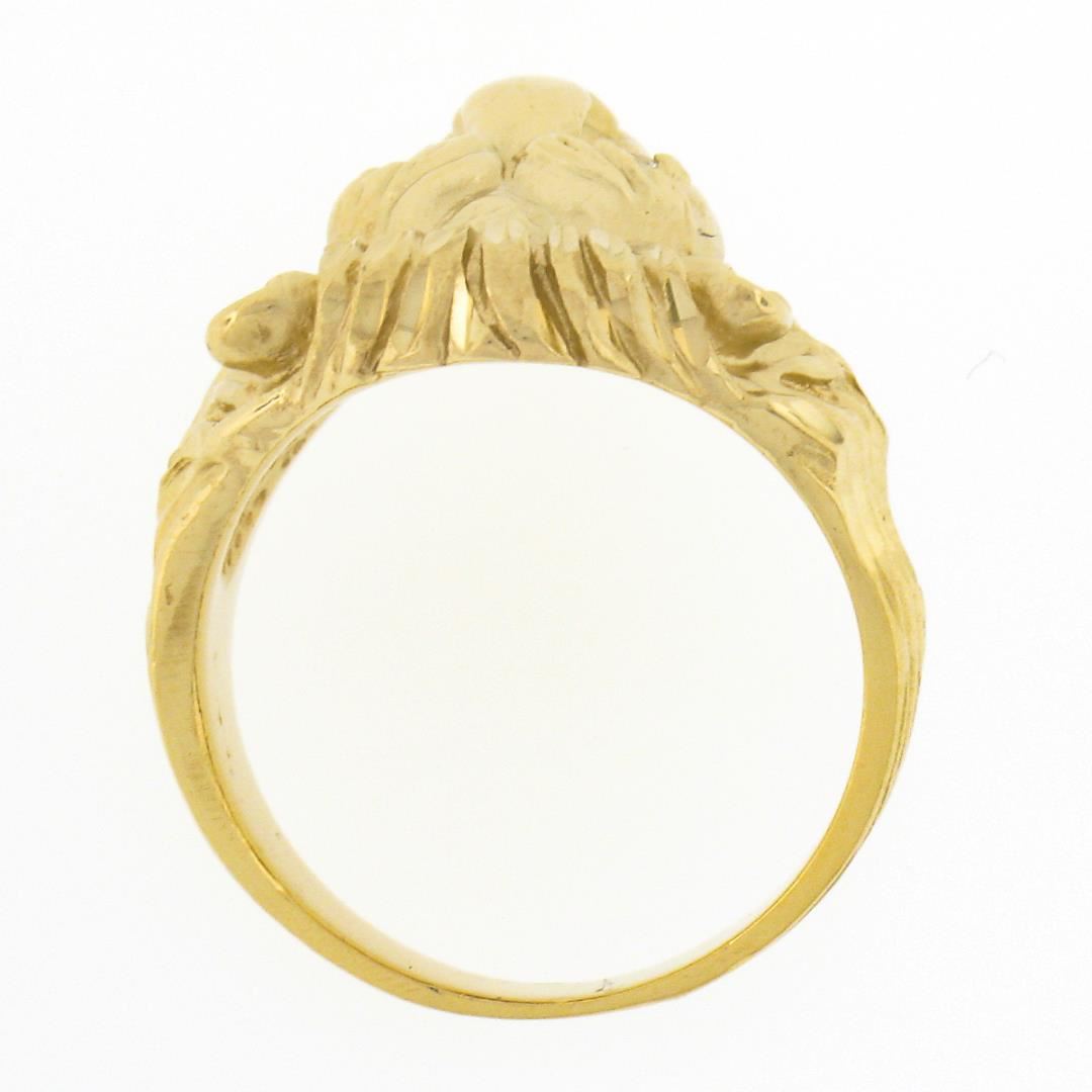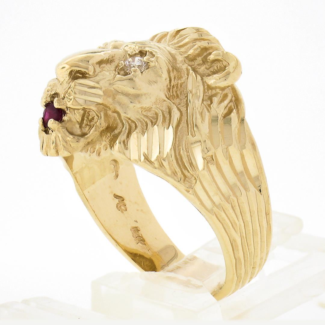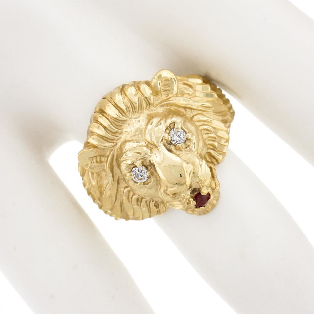 A solid 14k yellow gold lion ring, with 2 round brilliant cut natural diamonds (F/G - VS1/VS2 ; 0.08ctw), and 1 round brilliant cut natural ruby (0.05ct). The ring is size 8.5, weighs a total of 12.22 grams, and measures 20mm wide.