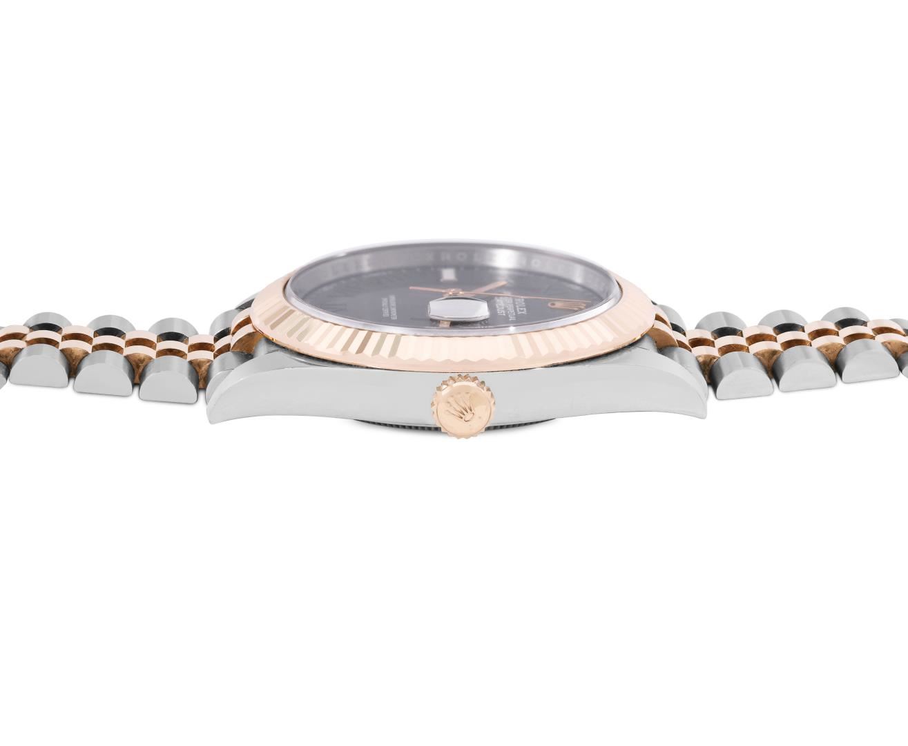 One Mens Pre Owned 18K Rose Gold And Stainless Steel Rolex Datejust 41MM Polished, Serviced and Electronically Tested, Rolex Rose Gold and Stainless Steel Case: 41mm, Rolex Yellow Gold Crown, Rolex Bezel: 18K Rose Gold Fluted Bezel. Crystal: Sapphire With Magnified Date Window. Rolex Hands: Lumi Hands. Rolex Movement: Automatic Winding Movement 3235. Rolex Dial: Factory Wimbledon Dial with Roman Hour Markers. Date Window: 3 O'Clock Position Date Display, Quickset, Model: Datejust 41MM. Condition: G-6 Extra Fine. Rolex Bracelet: Two Tone 18K Rose Gold And Stainless Steel Jubilee Band. Bright Polish. 7.0 Inch Length, Adjustable. Standard Clasp, With Rolex Logo. This Watch Has Been Serviced And Polished It Is Free Of All Scratches And Dents. This Watch Comes With A Rolex Box and Card.