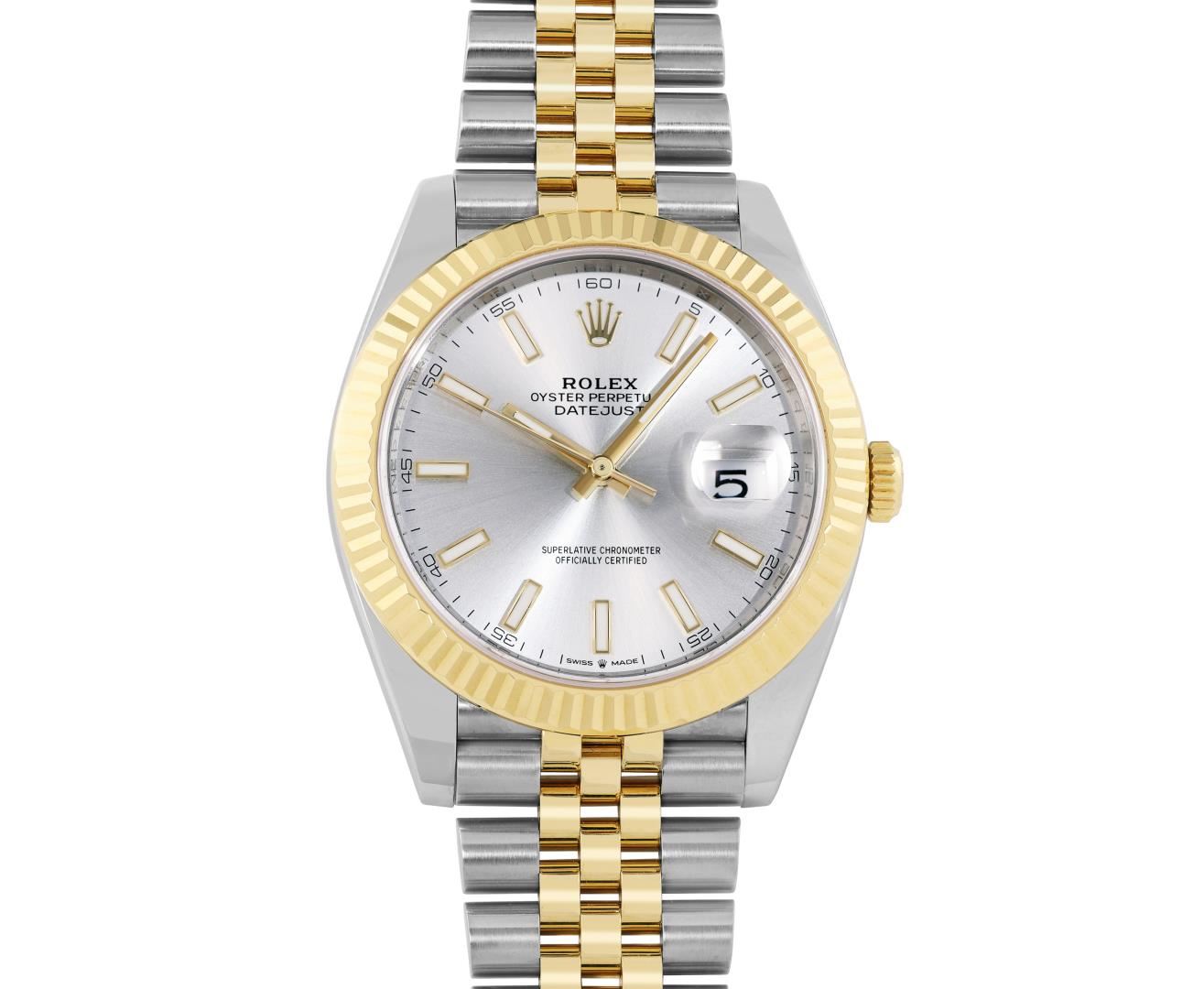 One Mens Pre Owned 18K Yellow Gold And Stainless Steel Rolex Datejust 41MM Polished, Serviced and Electronically Tested, Rolex Yellow Gold and Stainless Steel Case: 41mm, Rolex Yellow Gold Crown, Rolex Bezel: 18K Yellow Gold Fluted Bezel. Crystal: Sapphire With Magnified Date Window. Rolex Hands: Lumi Hands. Rolex Movement: Automatic Winding Movement 3235. Rolex Dial: Factory Silver Dial with Luminous Index Hour Markers. Date Window: 3 O'Clock Position Date Display, Quickset, Model: Datejust 41MM. Condition: G-6 Extra Fine. Rolex Bracelet: Two Tone 18K Yellow Gold And Stainless Steel Jubilee Band. Bright Polish. 7.0 Inch Length, Adjustable. Standard Clasp, With Rolex Logo. This Watch Has Been Serviced And Polished It Is Free Of All Scratches And Dents.