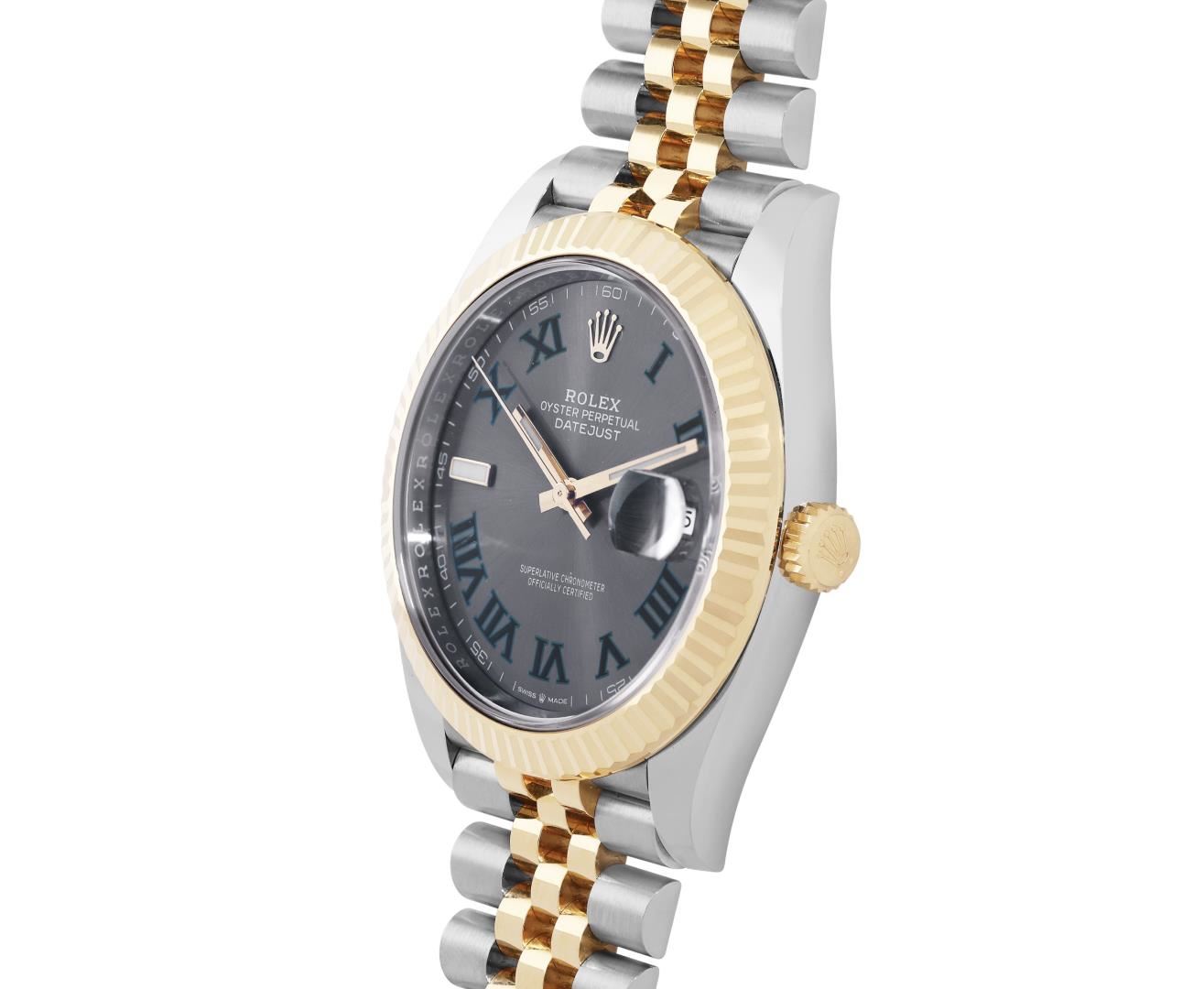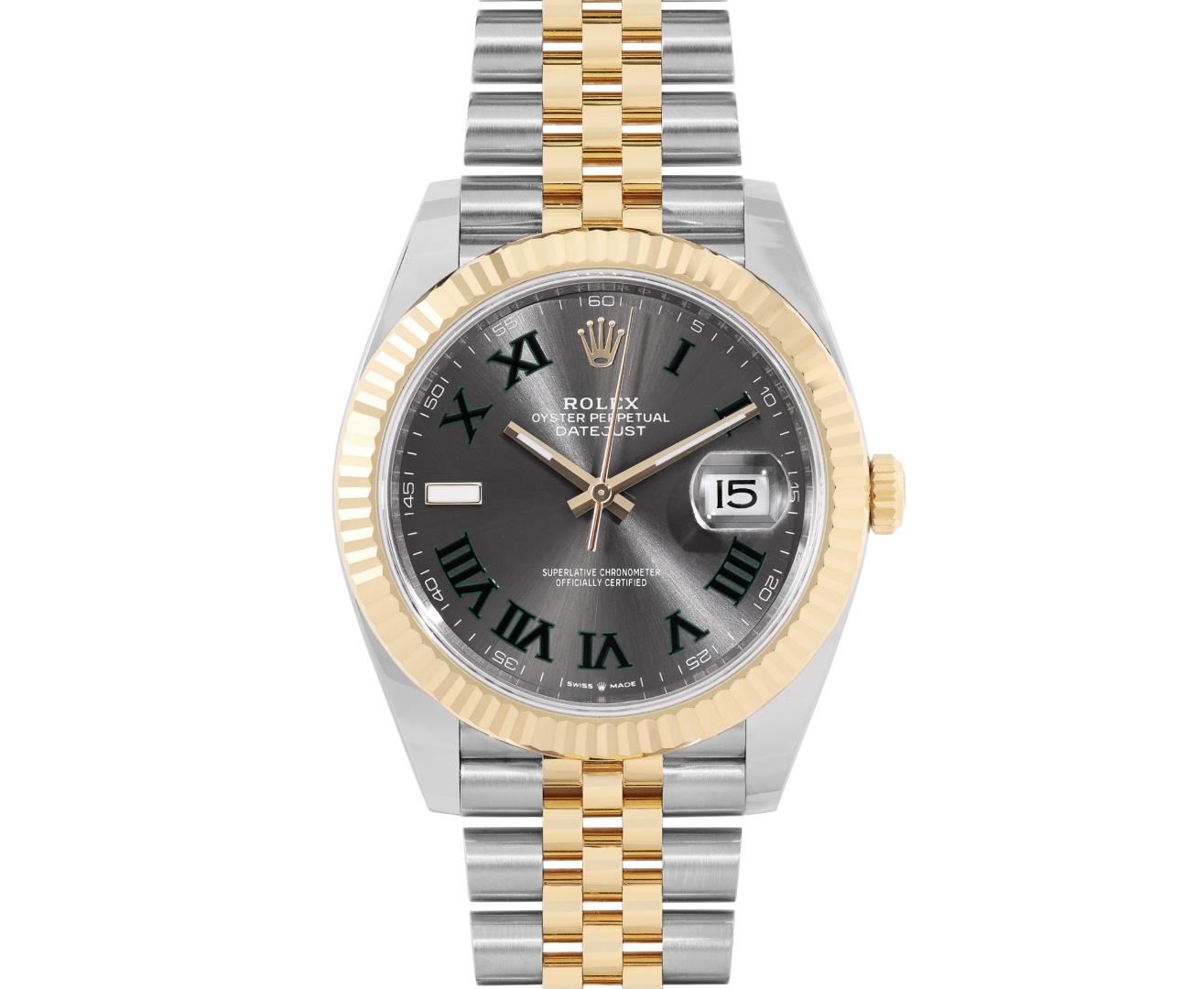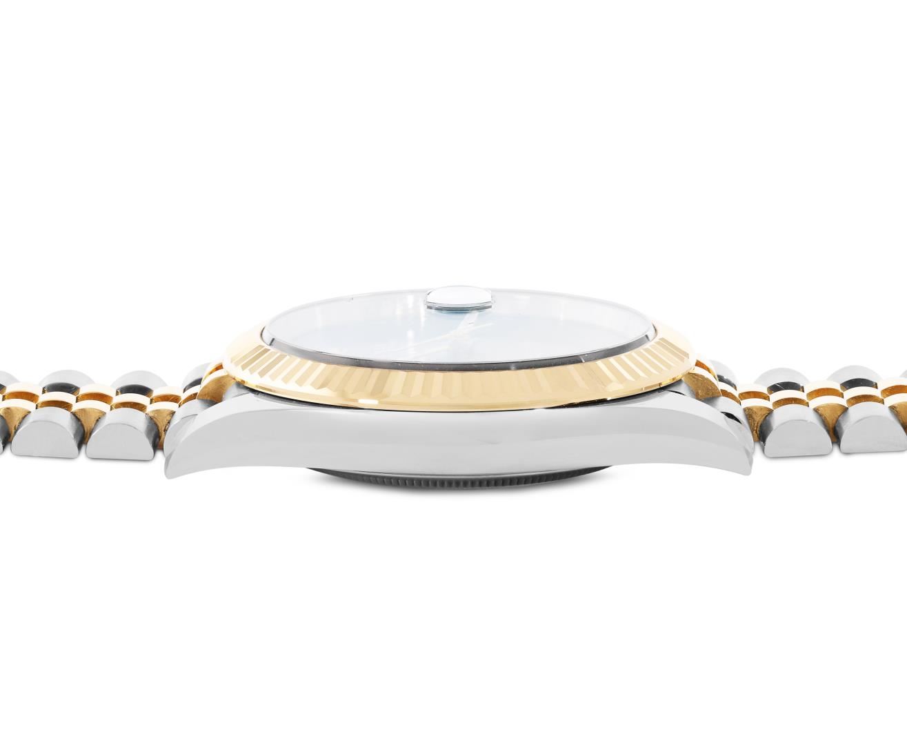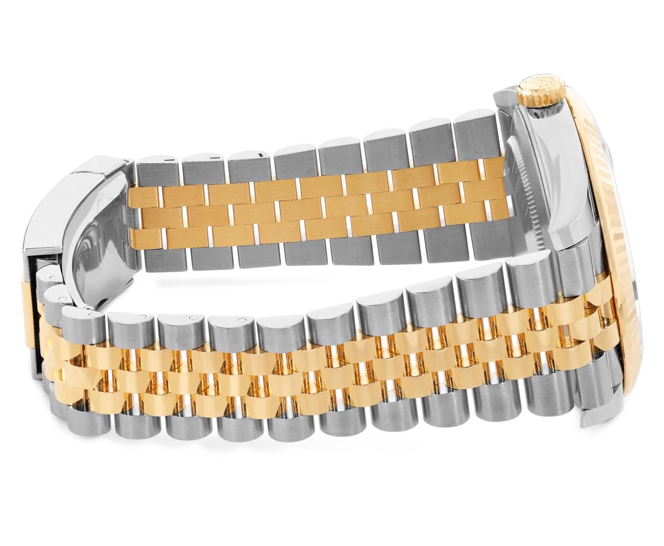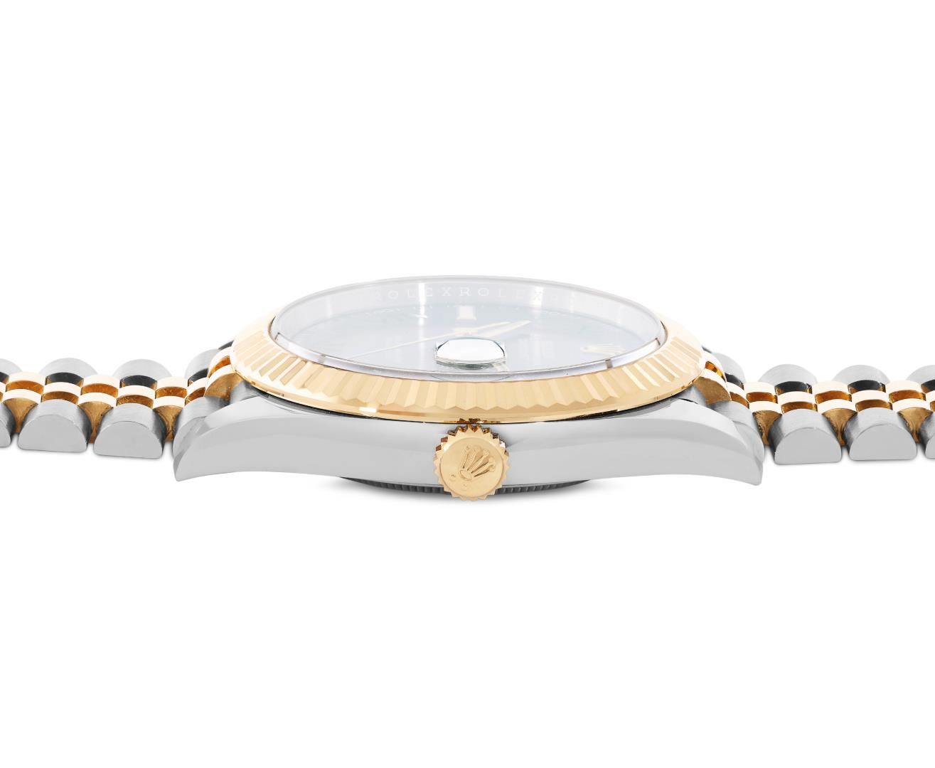 One Mens Pre Owned 18K Yellow Gold And Stainless Steel Rolex Datejust 41MM Polished, Serviced and Electronically Tested, Rolex Yellow Gold and Stainless Steel Case: 41mm, Rolex Yellow Gold Crown, Rolex Bezel: 18K Yellow Gold Fluted Bezel. Crystal: Sapphire With Magnified Date Window. Rolex Hands: Lumi Hands. Rolex Movement: Automatic Winding Movement 3235. Rolex Dial: Factory Wimbledon Dial with Roman Hour Markers. Date Window: 3 O'Clock Position Date Display, Quickset, Model: Datejust 41MM. Condition: G-6 Extra Fine. Rolex Bracelet: Two Tone 18K Yellow Gold And Stainless Steel Jubilee Band. Bright Polish. 7.0 Inch Length, Adjustable. Standard Clasp, With Rolex Logo. This Watch Has Been Serviced And Polished It Is Free Of All Scratches And Dents. This Watch Comes With A Rolex Box and Card.