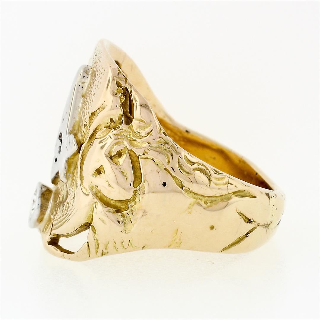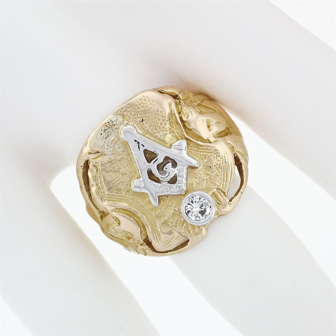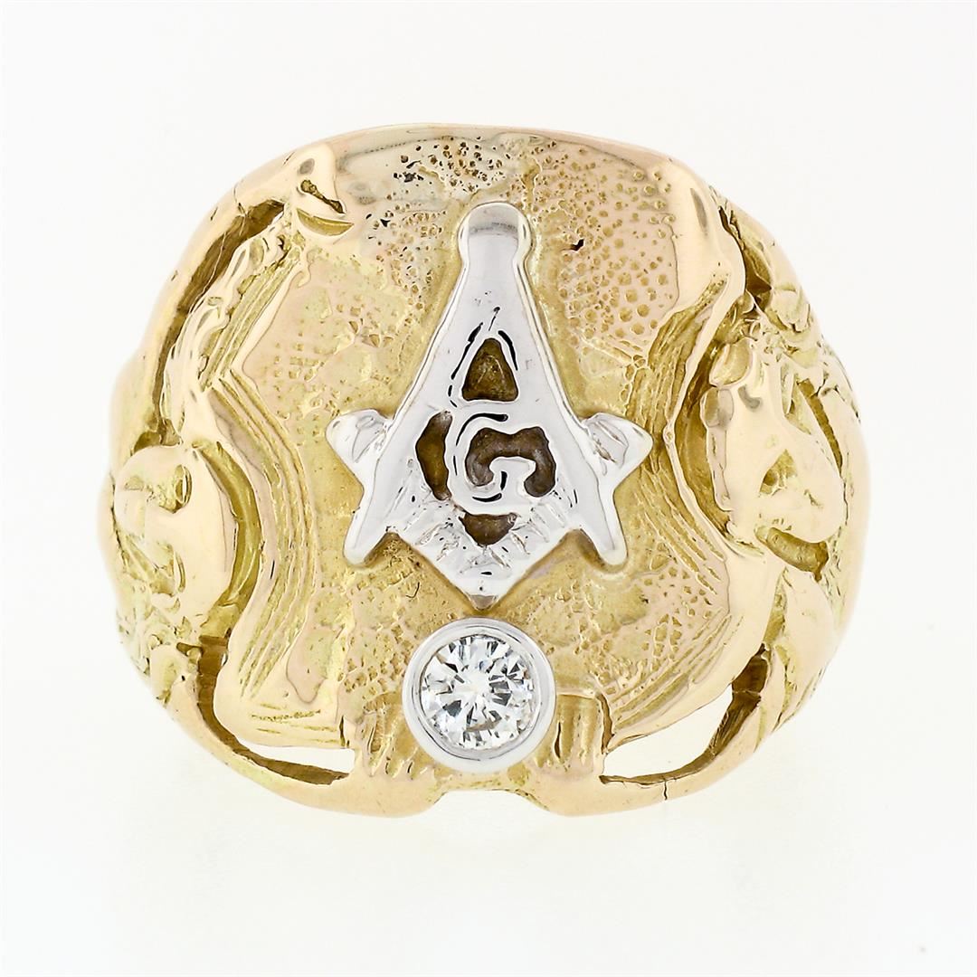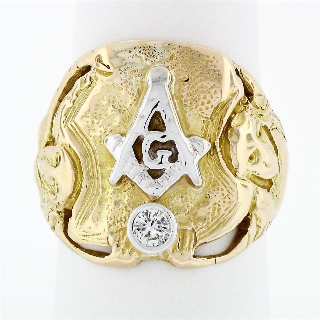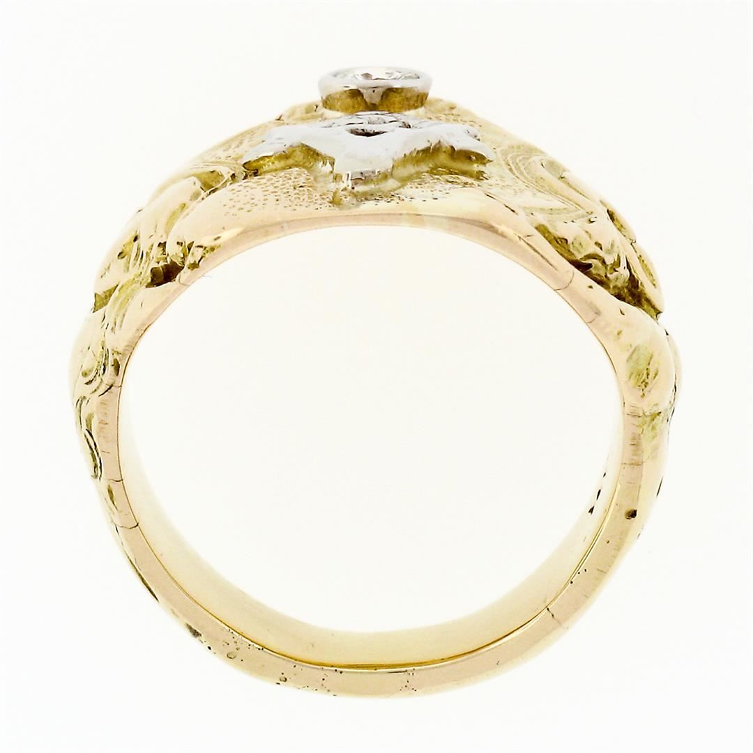 An art nouveau period solid 14k two tone gold masonic nymph ring, with 1 round transitional cut natural diamond (G - SI1; 0.16ct). The ring is size 7.0, weighs a total of 12.46 grams, and measures 19.34mm wide.