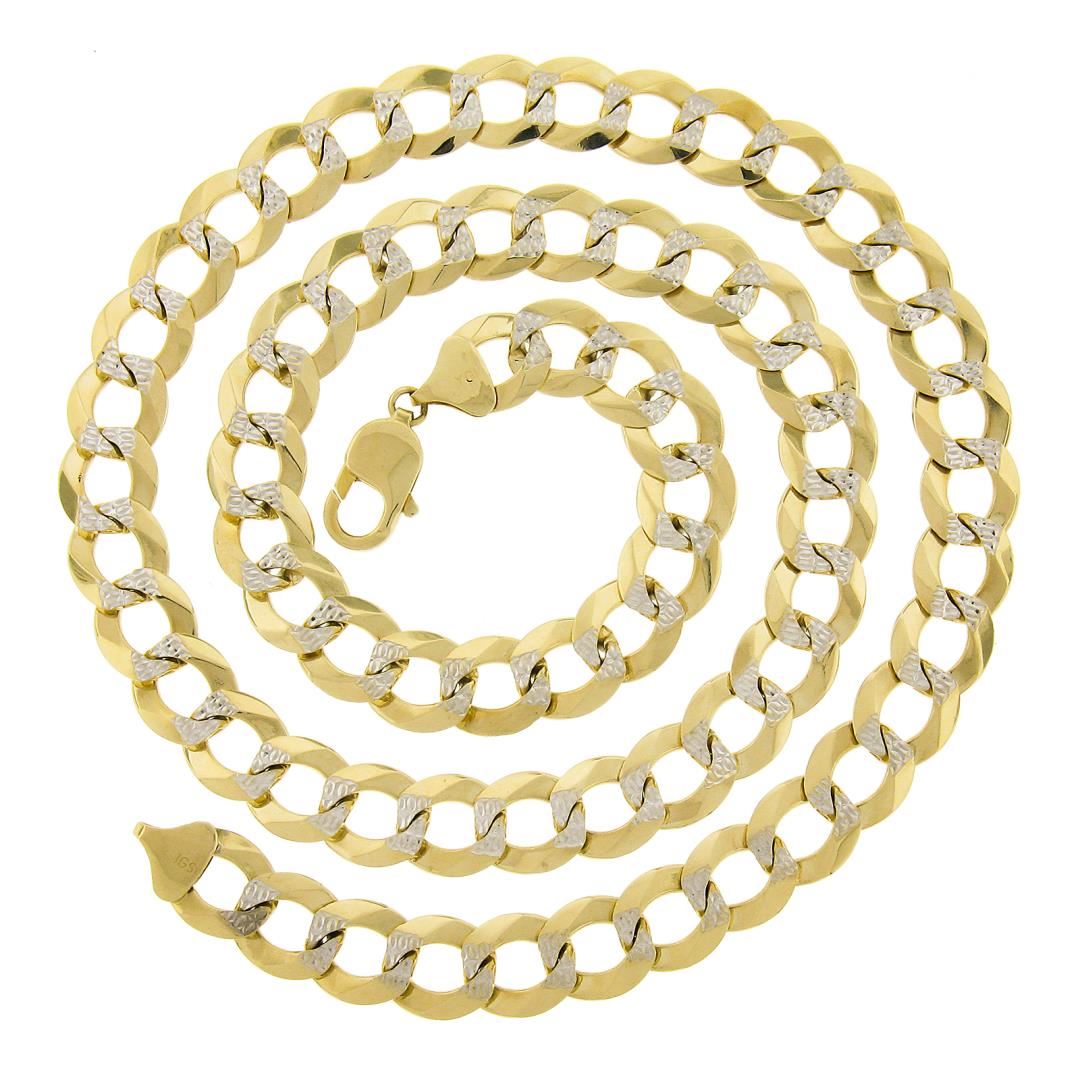 A solid 14k yellow and white gold cuban curb link necklace. It weighs a total of 99.31 grams, measures 12.3mm wide, and measures 27.5 inches in length.
