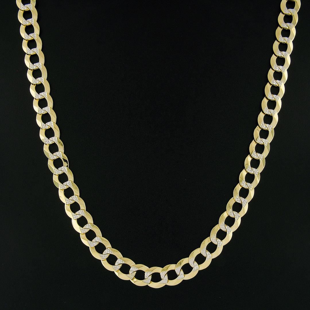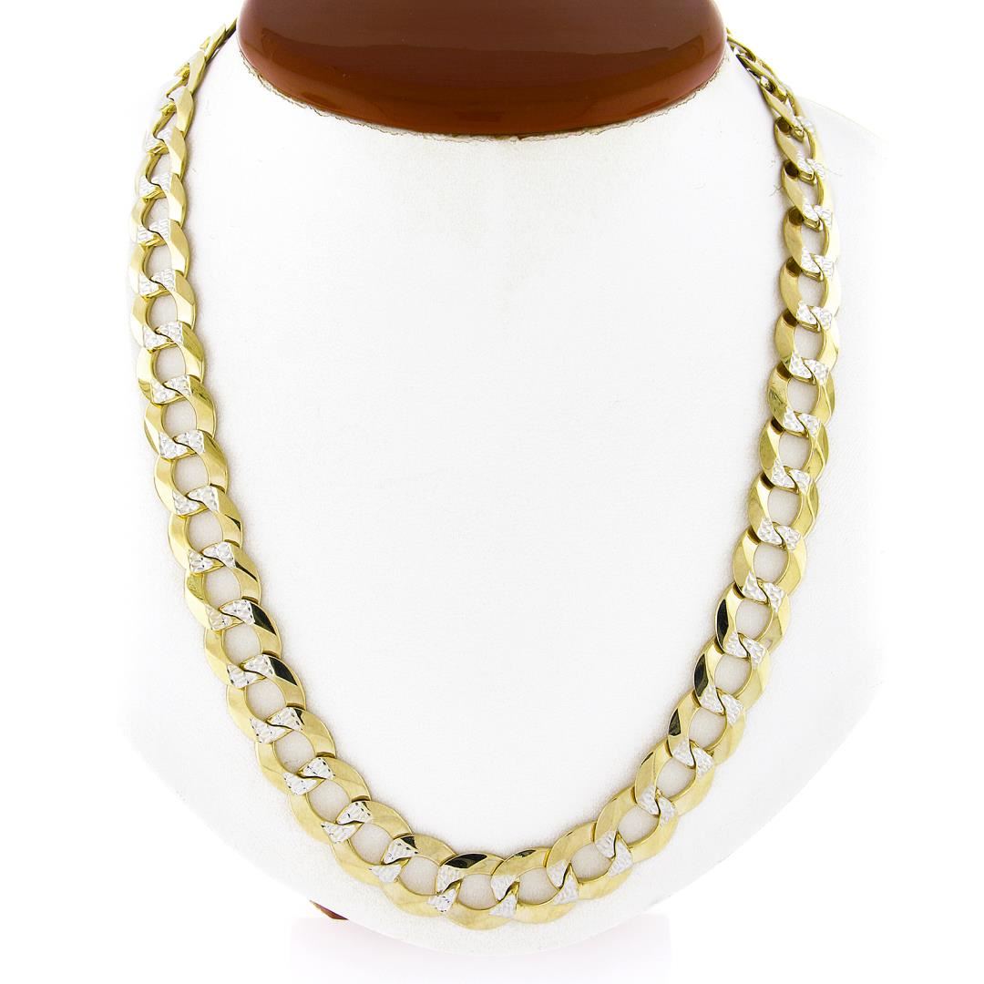 A solid 14k yellow and white gold cuban curb link necklace. It weighs a total of 99.31 grams, measures 12.3mm wide, and measures 27.5 inches in length.