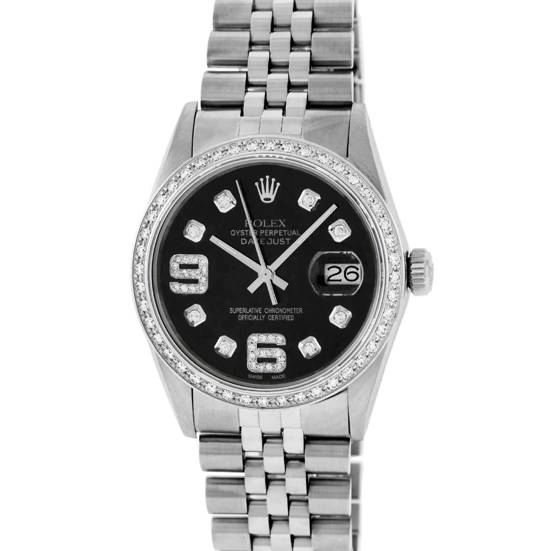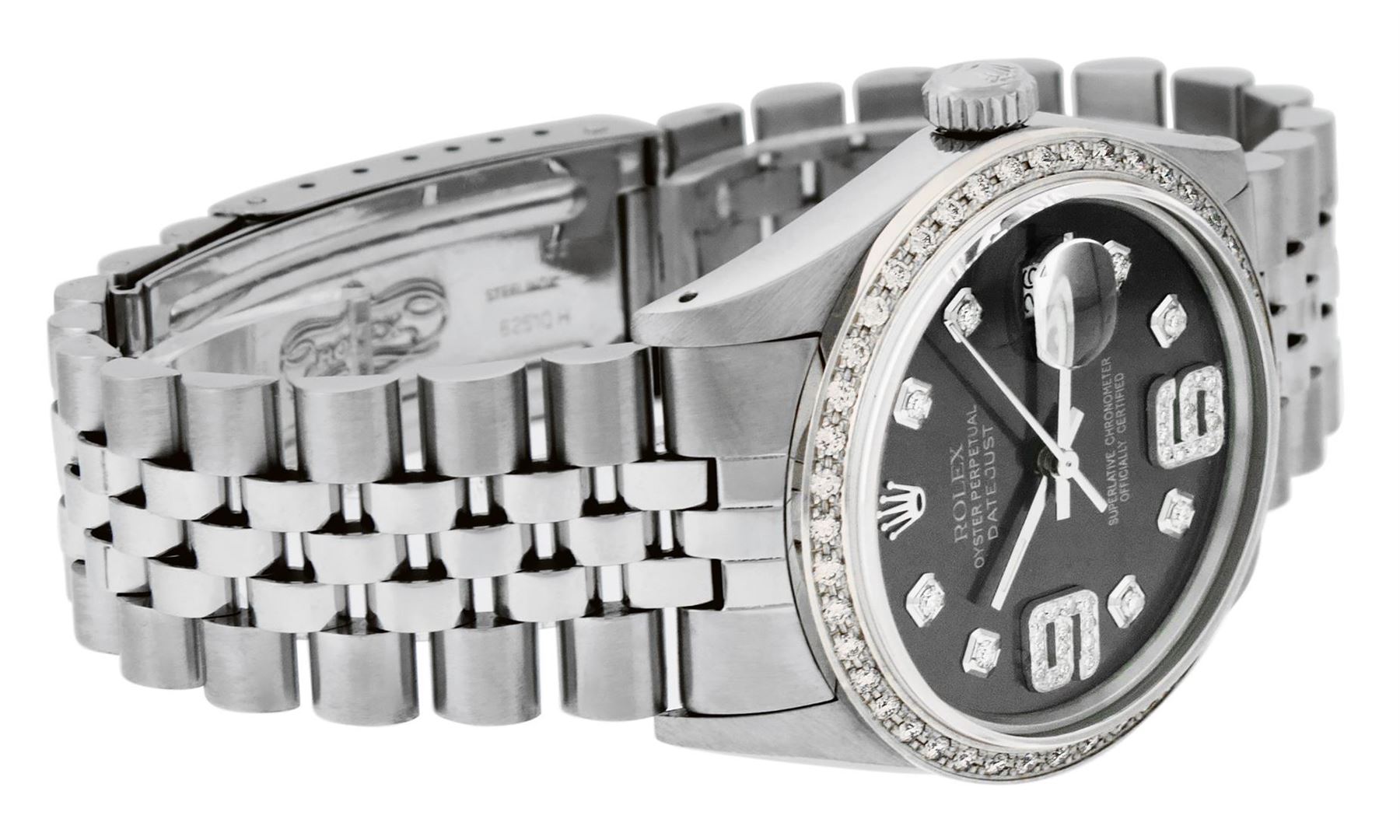 One Mens Pre Owned Stainless Steel Rolex Datejust Polished, Serviced & Electronically Tested, Rolex Stainless Steel Case: 36mm, Rolex Stainless Steel Crown, Custom Bezel: New 18K White Gold Bead set Diamond Bezel, Diamond Count: 44 Diamonds, Total Weight