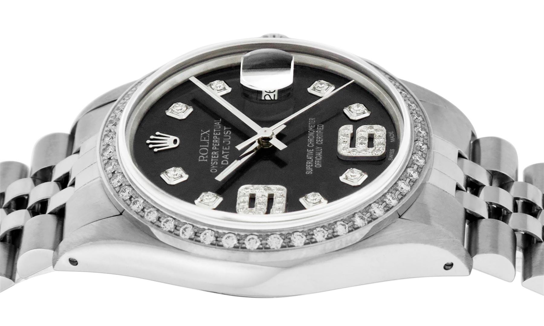 One Mens Pre Owned Stainless Steel Rolex Datejust Polished, Serviced & Electronically Tested, Rolex Stainless Steel Case: 36mm, Rolex Stainless Steel Crown, Custom Bezel: New 18K White Gold Bead set Diamond Bezel, Diamond Count: 44 Diamonds, Total Weight