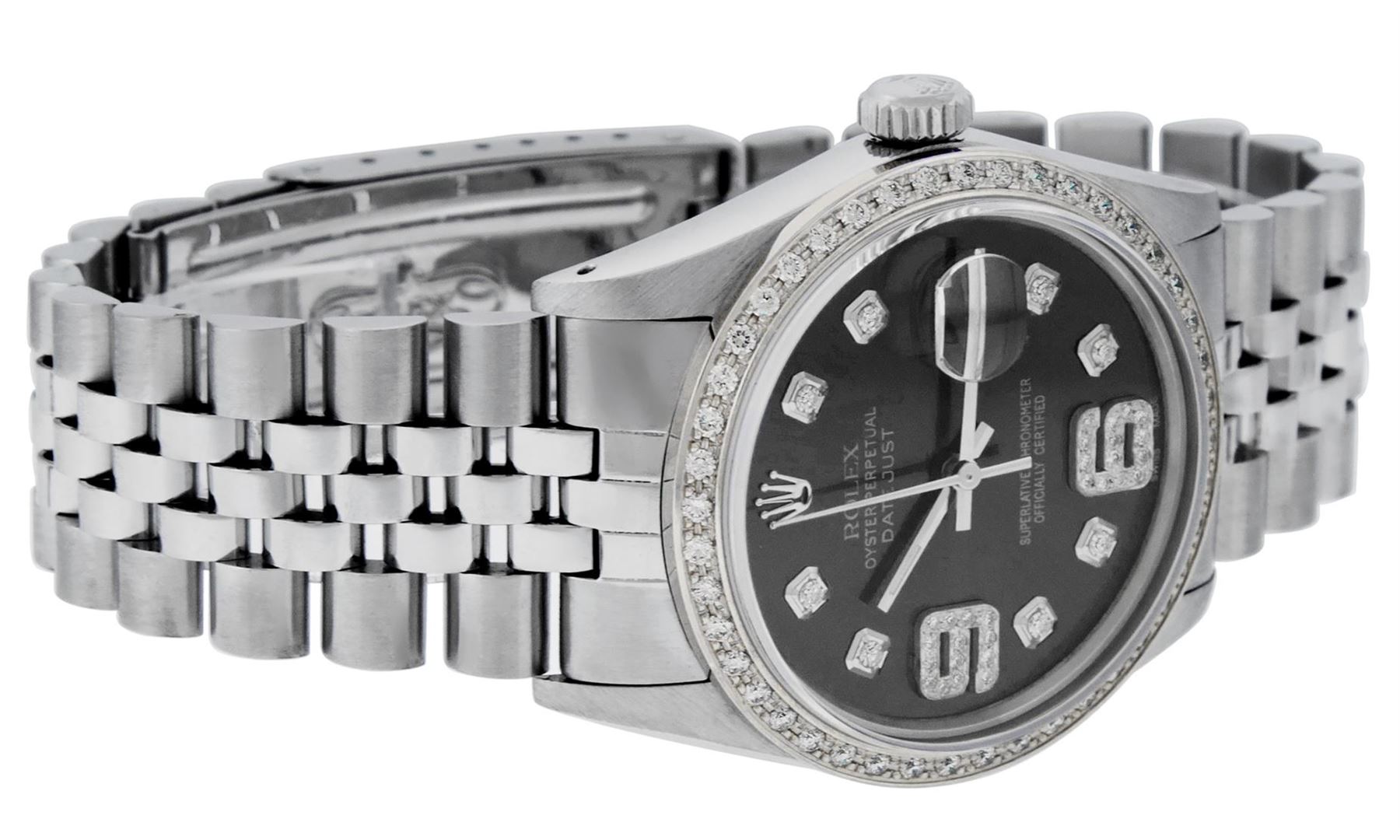 One Mens Pre Owned Stainless Steel Rolex Datejust Polished, Serviced & Electronically Tested, Rolex Stainless Steel Case: 36mm, Rolex Stainless Steel Crown, Custom Bezel: New 18K White Gold Bead set Diamond Bezel, Diamond Count: 44 Diamonds, Total Weight 1.00 Carat, Clarity: SI-VS, Color: G to H. Custom Crystal: New Sapphire With Magnified Date. Custom Hands: New Luminescent Hands. Rolex Movement: Automatic Winding Movement. Custom Dial: Refinished To Black With Custom Added Diamond Hour Markers, Diamond Count: 8 Diamonds + 28 Diamonds On 6 & 9 Hour Markers, G To H In Color, Clarity: SI-VS. Date Window: 3 O'clock Position Date Display, Quickset, Model: Datejust. Condition: G-6 Extra Fine. Rolex Bracelet: Stainless Steel Jubilee Band. Bright Polish & Satin Finish. 7.0 Inch Length, Adjustable. Standard Clasp, With Rolex Logo. This Watch Has Been Serviced Time Tested And Is In Excellent Condition It Is Free Of All Scratches And Dents.