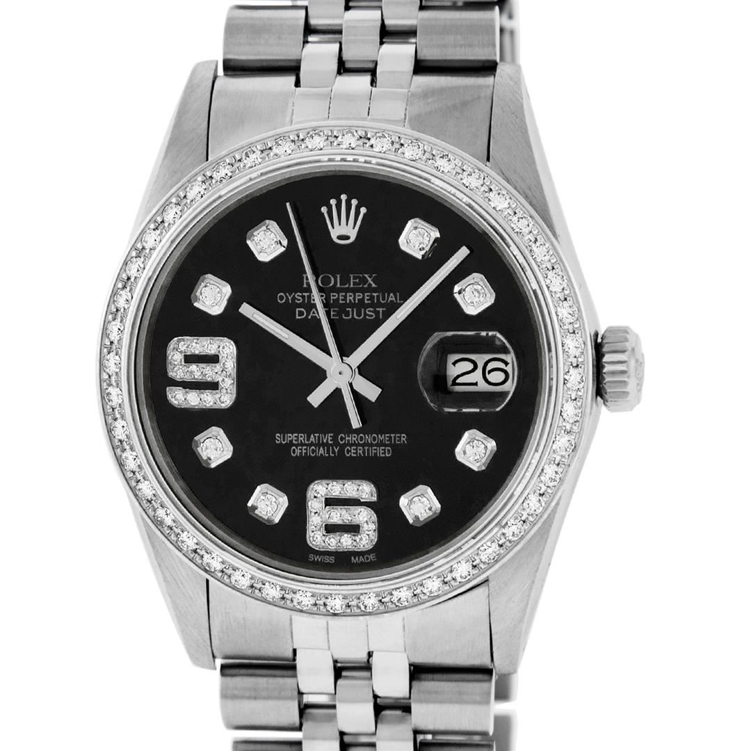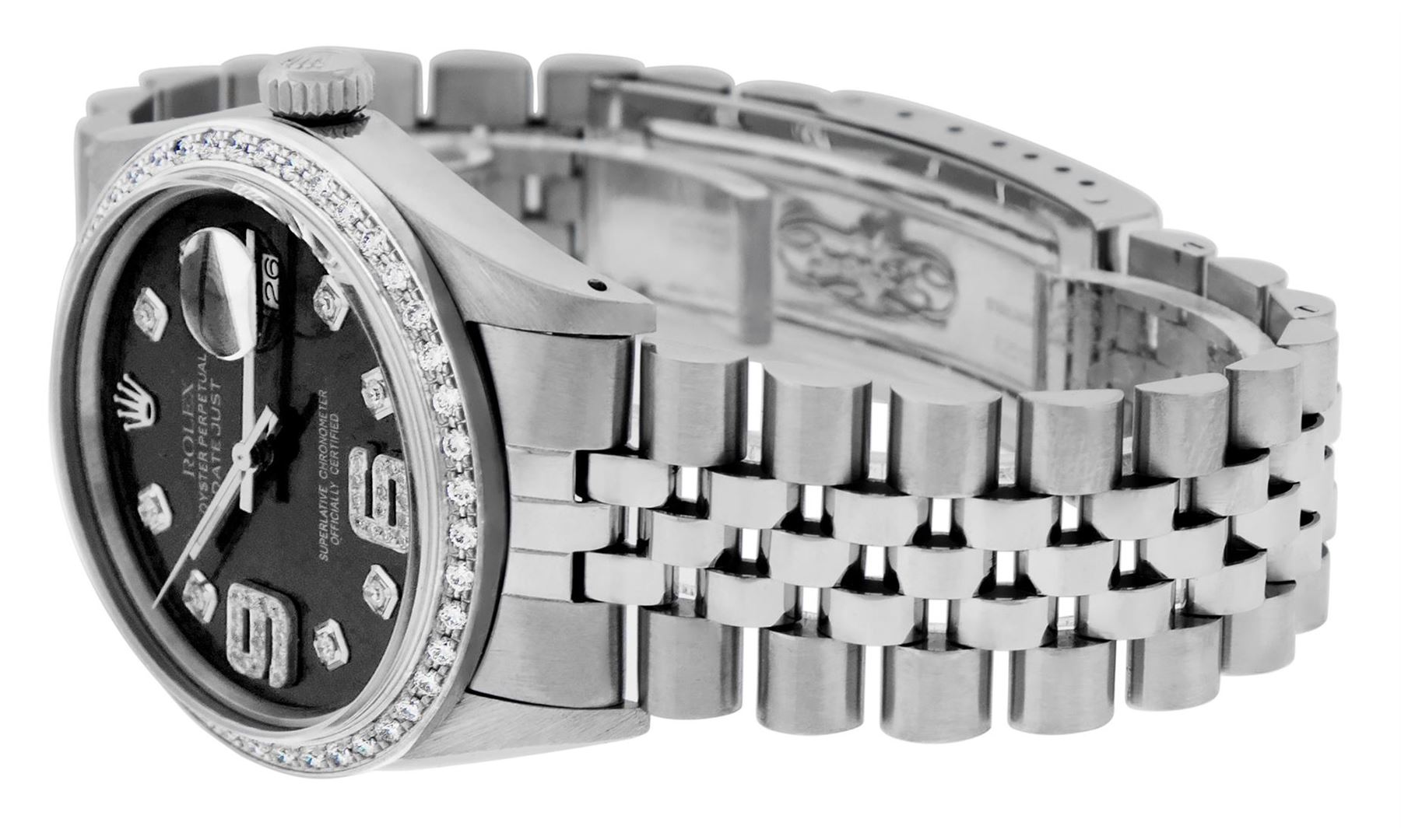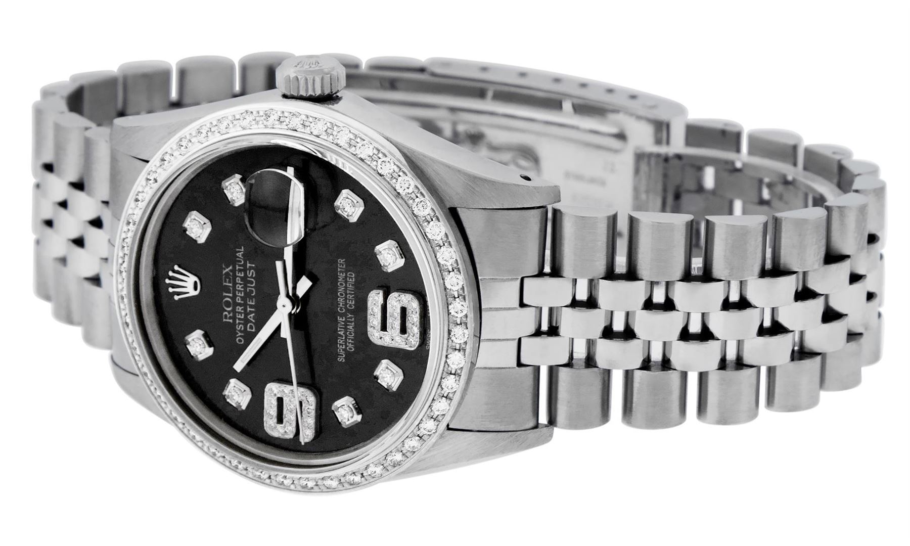One Mens Pre Owned Stainless Steel Rolex Datejust Polished, Serviced & Electronically Tested, Rolex Stainless Steel Case: 36mm, Rolex Stainless Steel Crown, Custom Bezel: New 18K White Gold Bead set Diamond Bezel, Diamond Count: 44 Diamonds, Total Weight 1.00 Carat, Clarity: SI-VS, Color: G to H. Custom Crystal: New Sapphire With Magnified Date. Custom Hands: New Luminescent Hands. Rolex Movement: Automatic Winding Movement. Custom Dial: Refinished To Black With Custom Added Diamond Hour Markers, Diamond Count: 8 Diamonds + 28 Diamonds On 6 & 9 Hour Markers, G To H In Color, Clarity: SI-VS. Date Window: 3 O'clock Position Date Display, Quickset, Model: Datejust. Condition: G-6 Extra Fine. Rolex Bracelet: Stainless Steel Jubilee Band. Bright Polish & Satin Finish. 7.0 Inch Length, Adjustable. Standard Clasp, With Rolex Logo. This Watch Has Been Serviced Time Tested And Is In Excellent Condition It Is Free Of All Scratches And Dents.