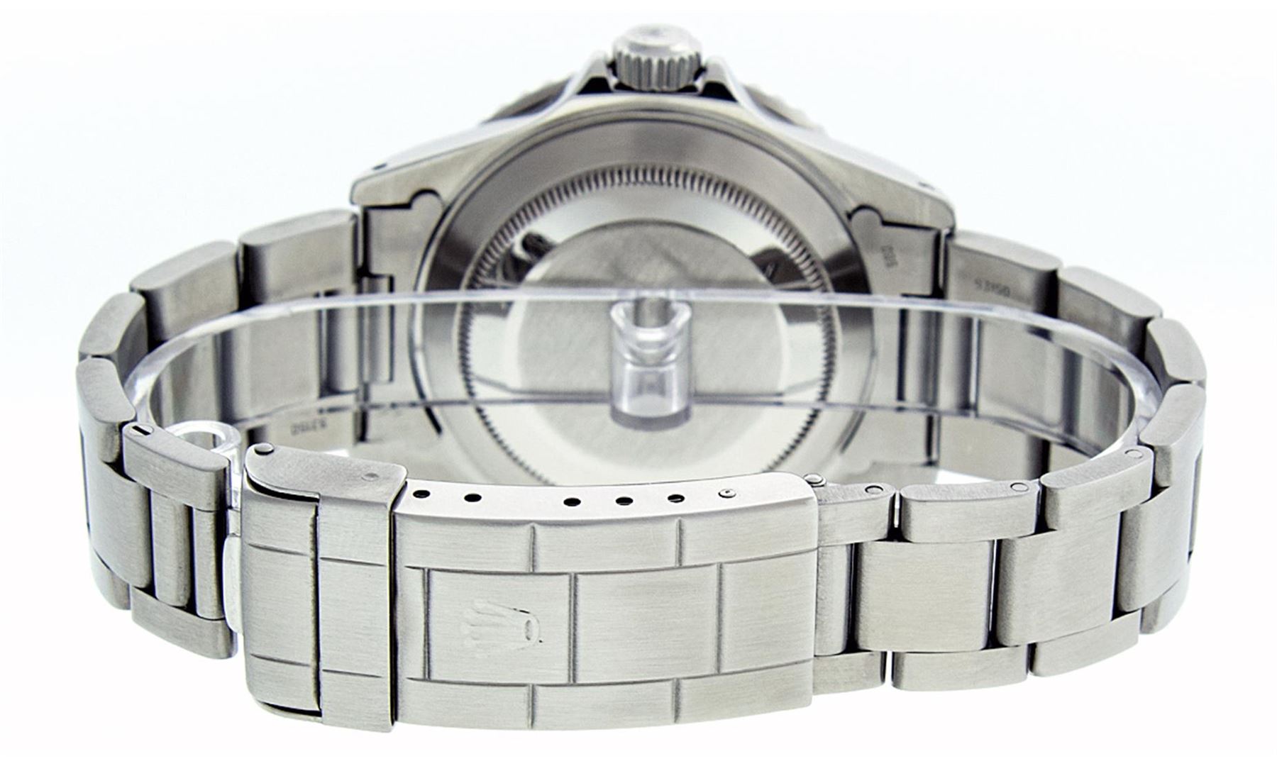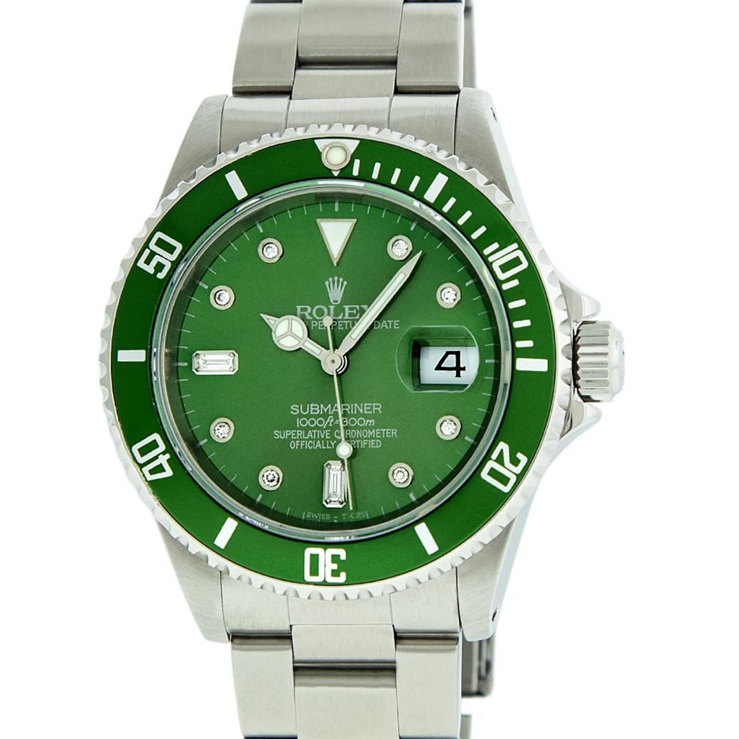 One Mens Rolex Submariner With Date Polished, Serviced & Electronically Tested, Stainless Steel Case:41mm, Stainless Steel Crown, Custom Bezel: Stainless Steel Rotatable Bezel With Custom Green Insert. Crystal: Synthetic Sapphire Cyclops Lens. Movement: Automatic Winding Movement Caliber 3135. Custom Dial: Green Diamond 8 + 2, Diamond Count: 8 Diamonds + 2 Baguettes In Dial, Color: G To H, Clarity: SI-VS. Date Window: 3 O'Clock Position Date Display, Model: Submariner 16610, Quickset, Condition: G-6 Extra Fine. Bracelet:Stainless Steel Oyster. Bright Polish & Satin Finish. 7.0 Inch Length, Adjustable. Standard Clasp, With Rolex Logo.