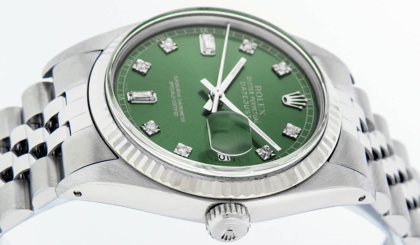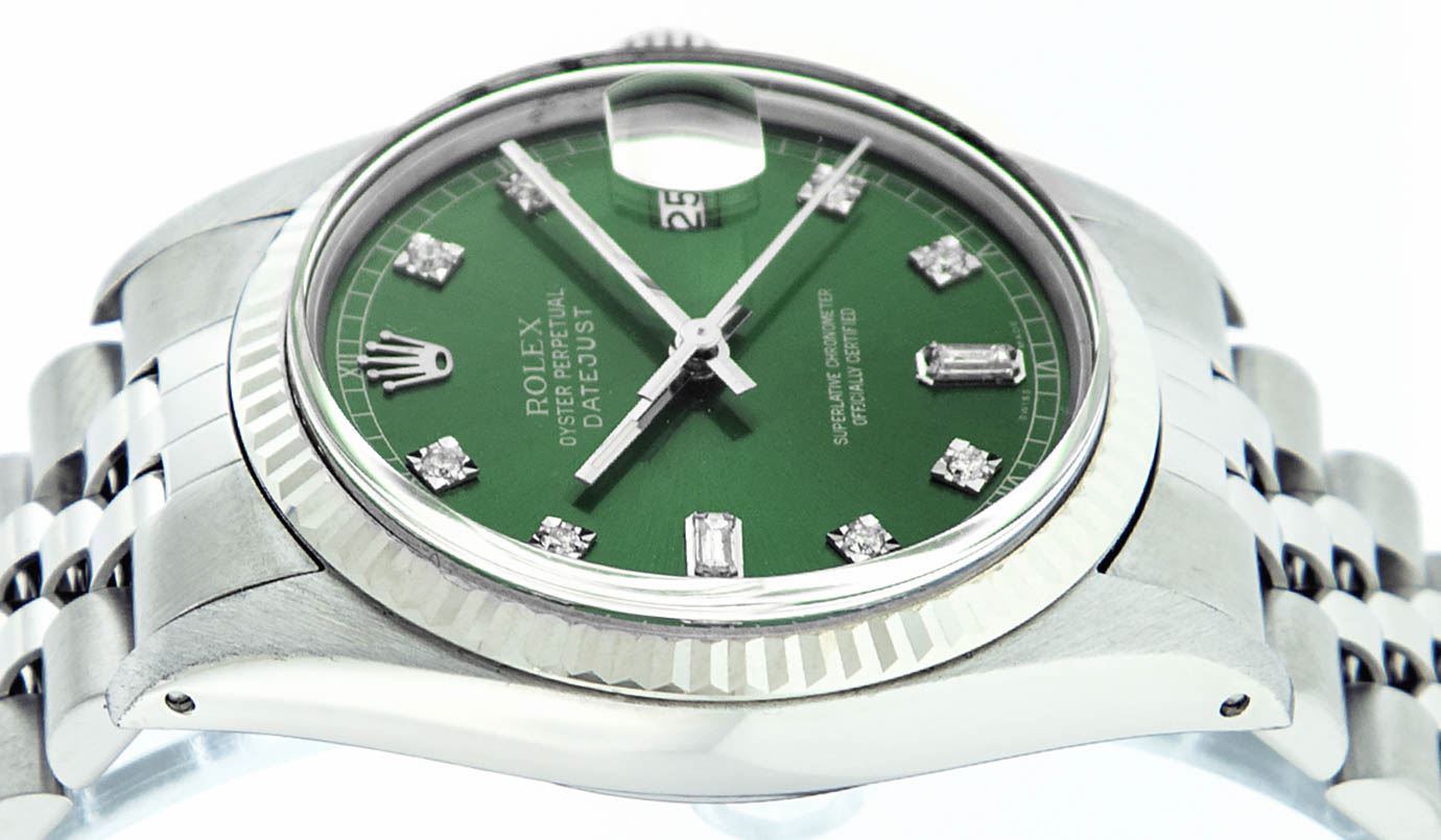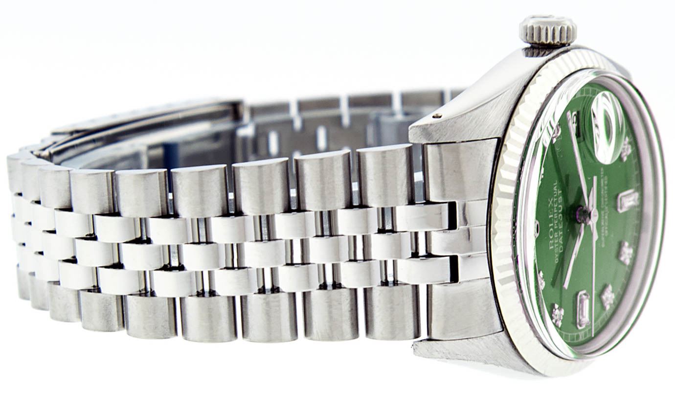 One Gents Rolex Datejust Polished, Serviced & Electronically Tested, Stainless Steel Case:36mm, Stainless Steel Crown, Bezel: 18K White Gold Fluted Bezel. Custom Crystal: Acrylic Cyclops Lens. Movement: Automatic Winding Movement Caliber 3035. Custom Dial: Green With Diamond Hour Markers And Square Roman Track Square Setting, Diamond Count: 8 Diamonds + 2 Baguettes, Clarity: SI-VS, Color: G to H. Date Window: 3 O'Clock Position Date Display, Quickset, Model: Datejust Condition: G-6 Extra Fine. Bracelet: Stainless Steel Jubilee. Bright Polish & Satin Finish. 7.0 Inch Length, Adjustable. Standard Clasp, With Rolex Logo.